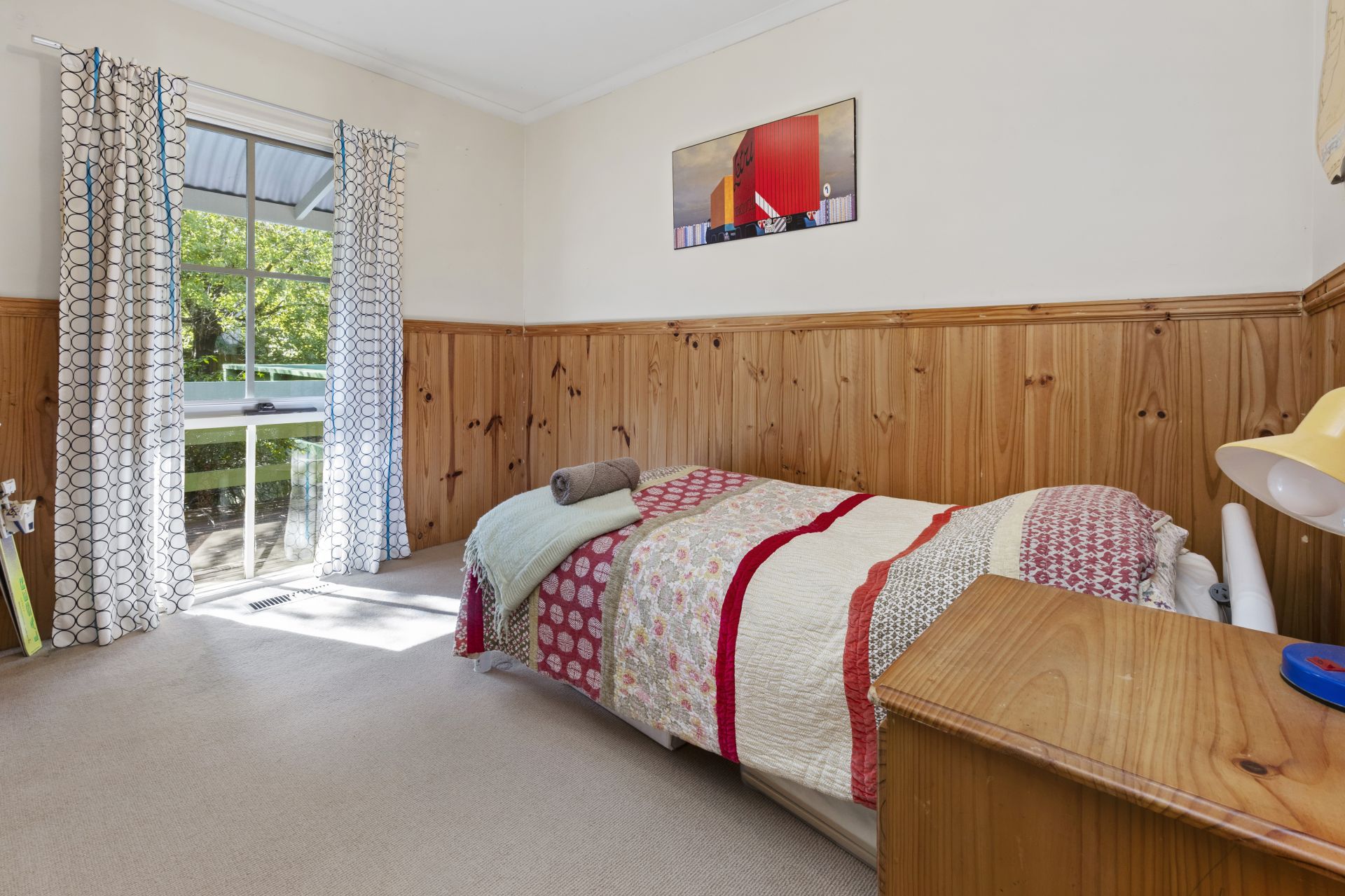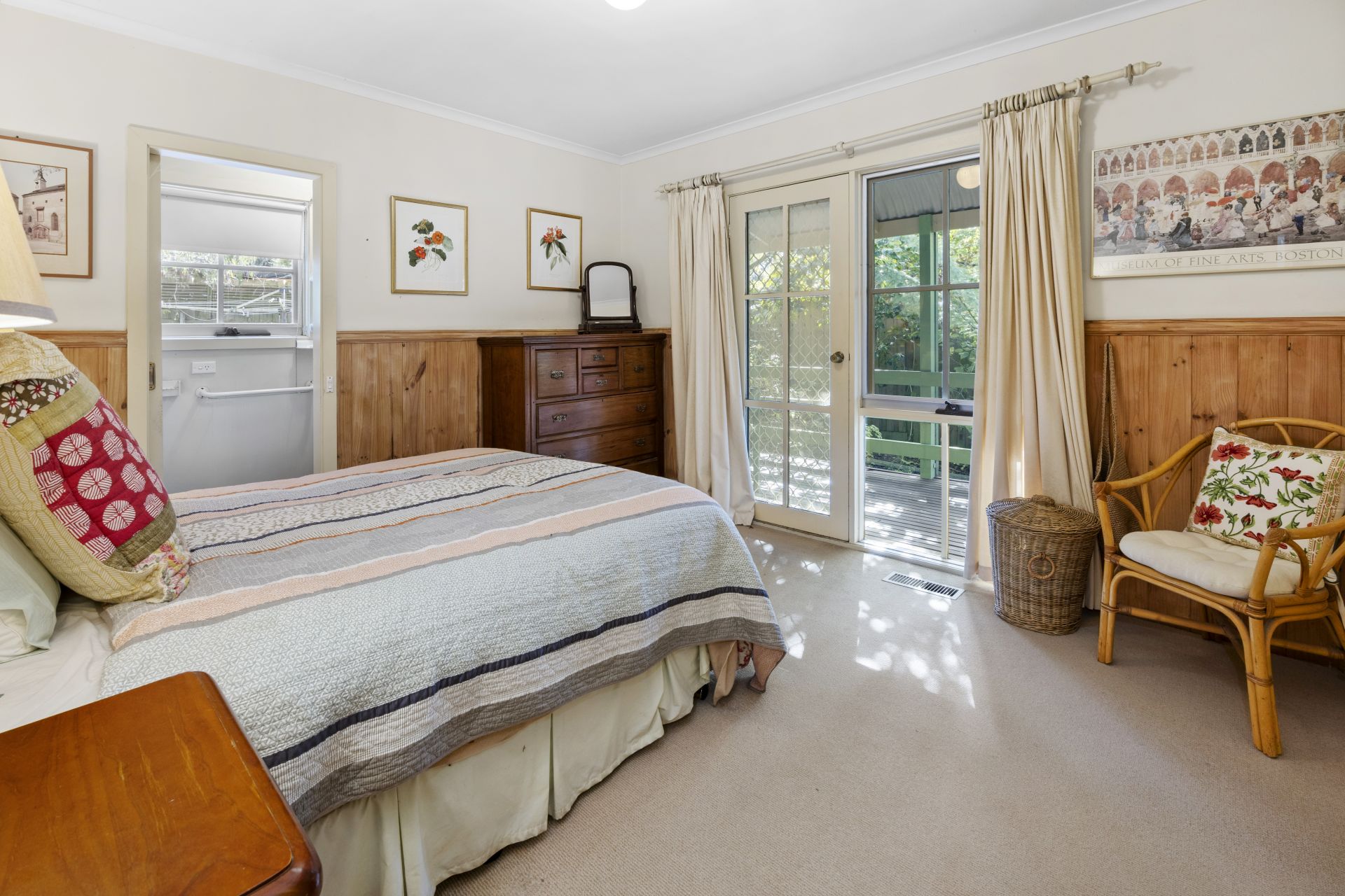 Down a hall, dado wall panelling carries the country character into all three bedrooms including the main bedroom with an ensuite, its own access to a covered deck and a discreet pull-down ladder into extensive attic storage space set in the high pitched roof.
