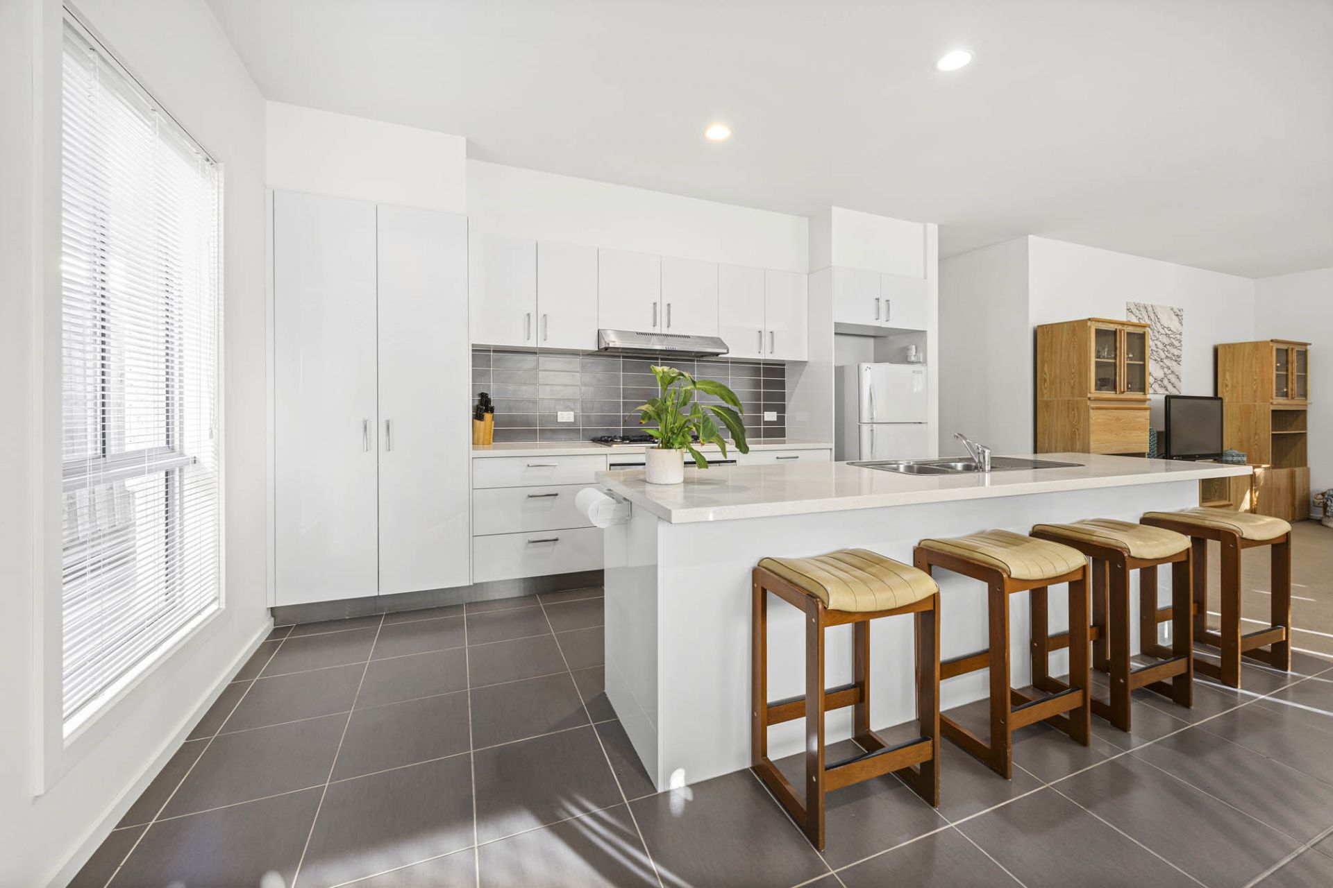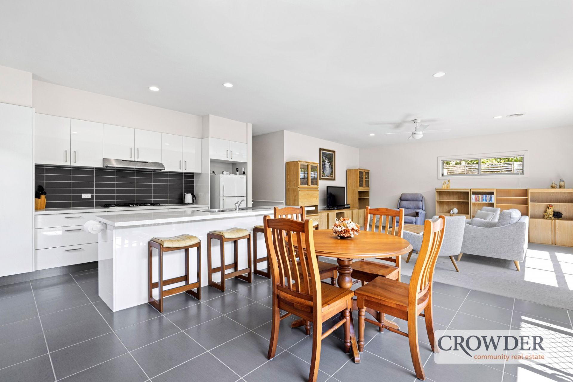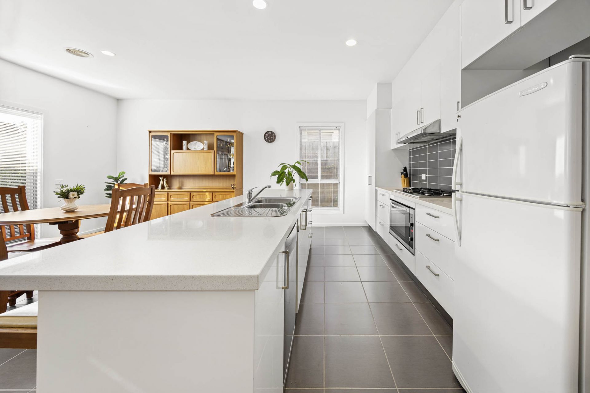 The designer kitchen is a standout, featuring a large breakfast bar, ample storage, a spacious pantry, and quality stainless-steel appliances, including a gas cooktop, electric oven, and dishwasher. Overlooking the light-filled open-plan living and dining area, the space is enhanced by gas ducted heating and split-system cooling for year-round comfort.
