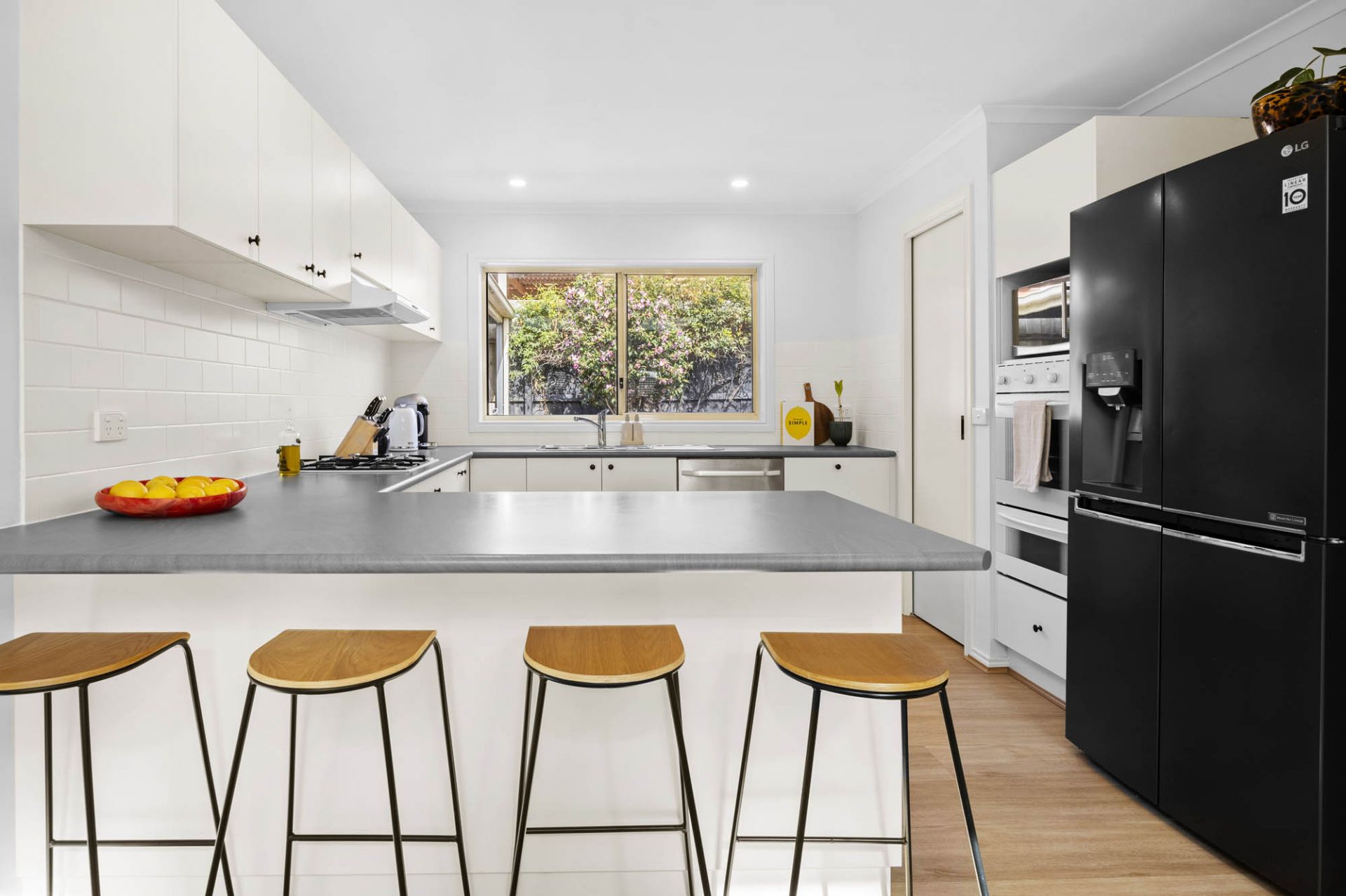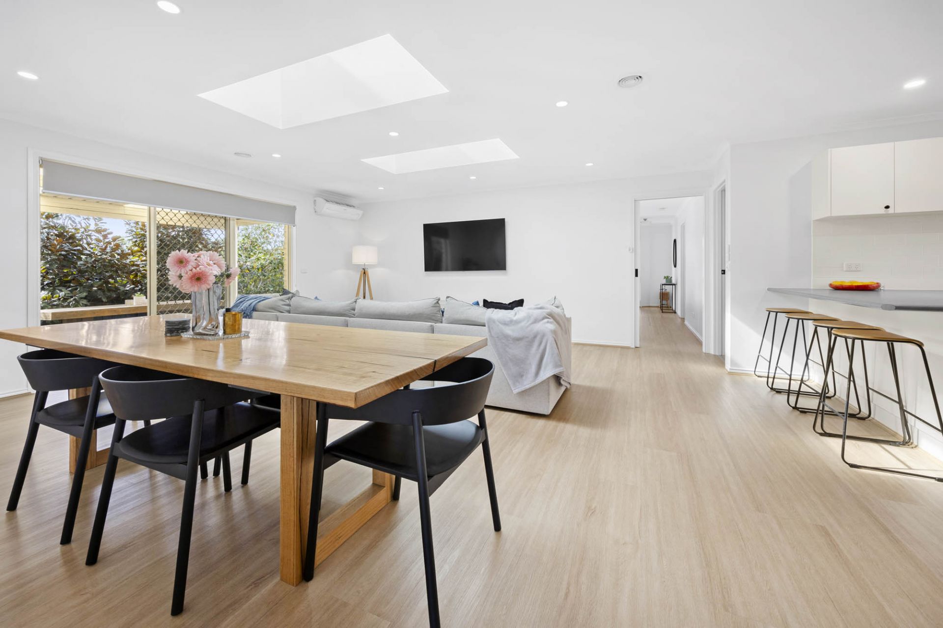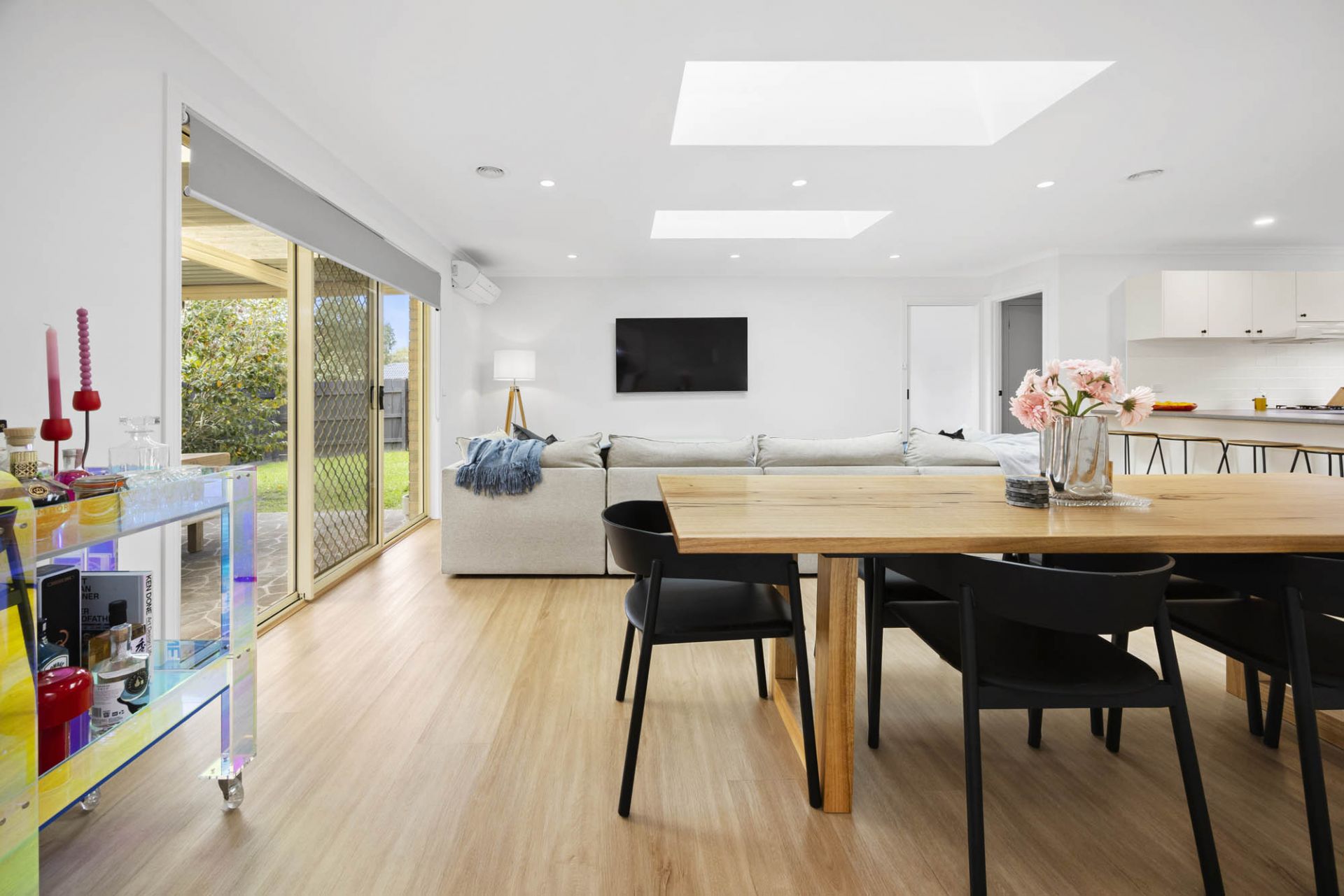 With a glorious north-facing aspect, 2 living areas enjoy stunning natural light featuring giant skylights that pour sunlight over an open plan lounge and dining area with beautiful hybrid flooring, while glass sliding doors provide lovely flow out to a covered alfresco terrace and gardens with space for children to play complete with lemon, mandarin, pear and olive trees.