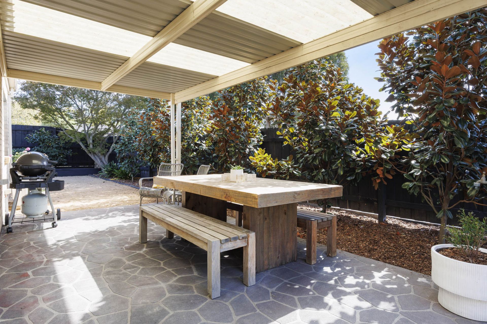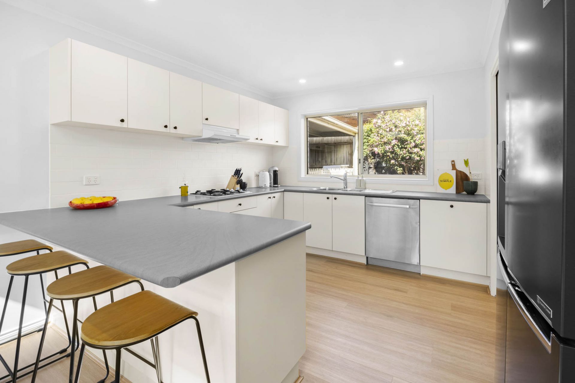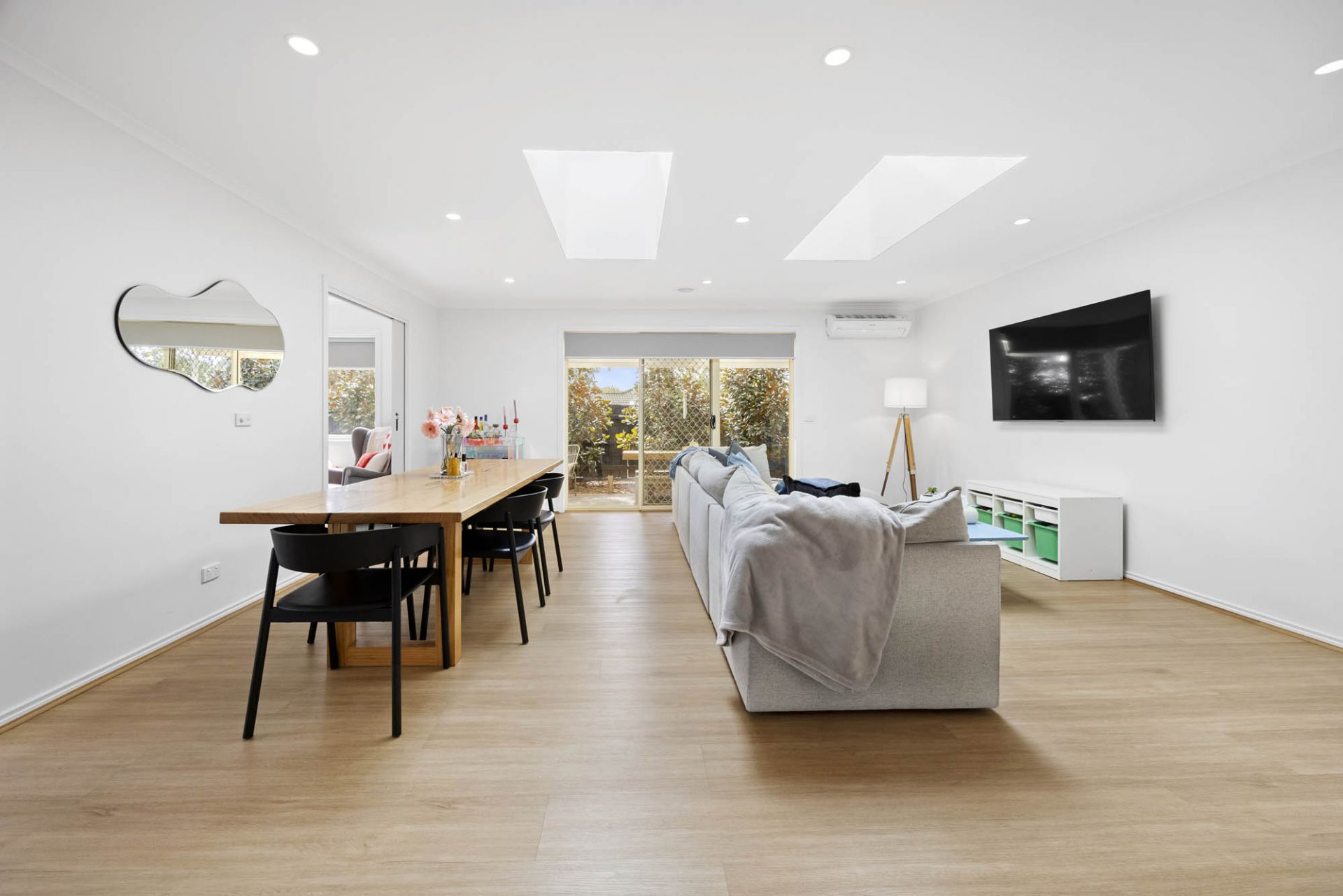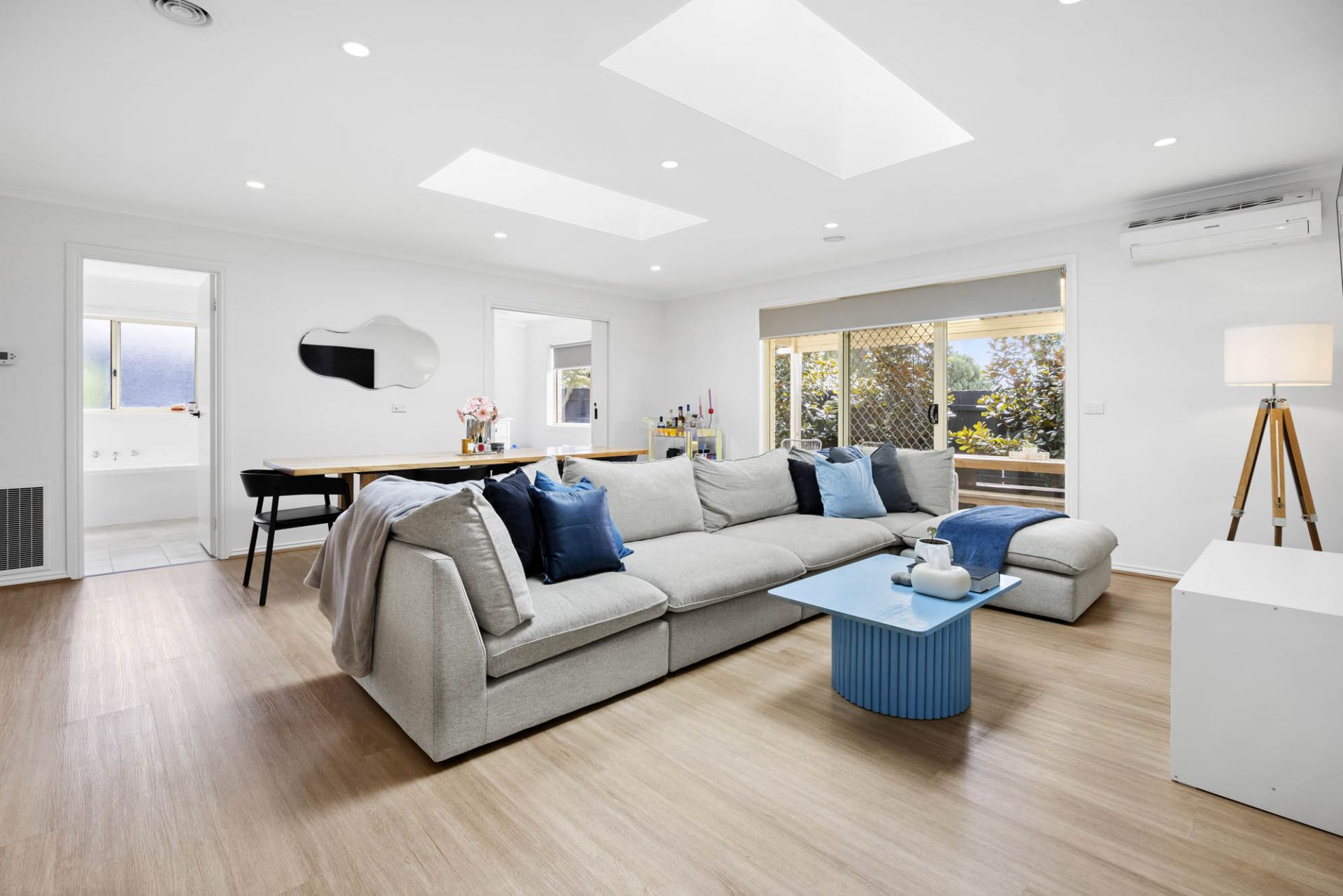 With a glorious north-facing aspect, 2 living areas enjoy stunning natural light featuring giant skylights that pour sunlight over an open plan lounge and dining area with beautiful hybrid flooring, while glass sliding doors provide lovely flow out to a covered alfresco terrace and gardens with space for children to play complete with lemon, mandarin, pear and olive trees.