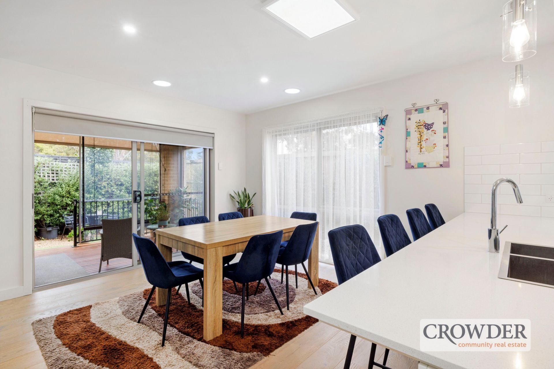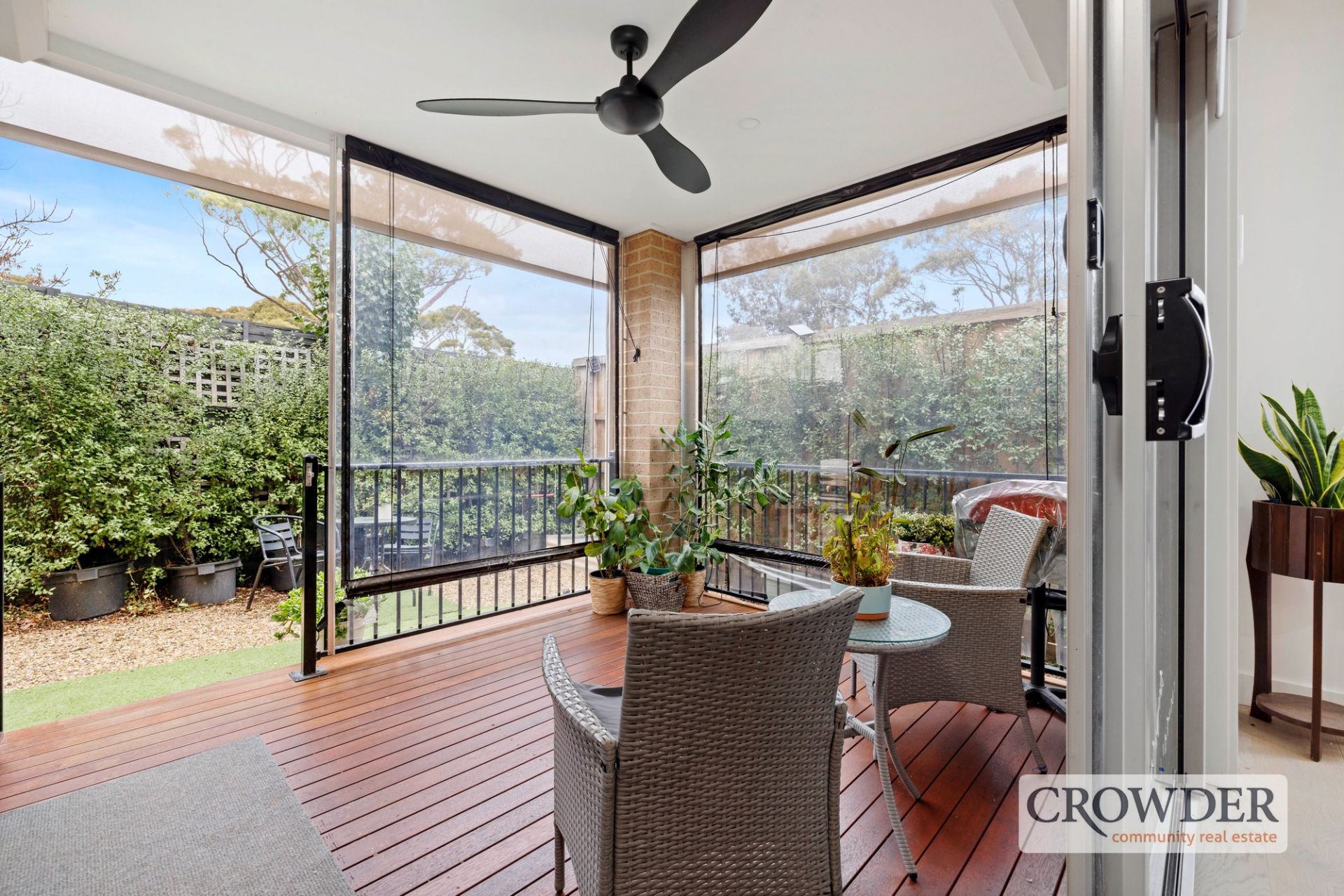 High ceilings and crisp neutral tones amplify the space and light in the main living area downstairs, which is adorned with oak floors and sliding glass doors to an alfresco deck enclosed by clear pull-down blinds.