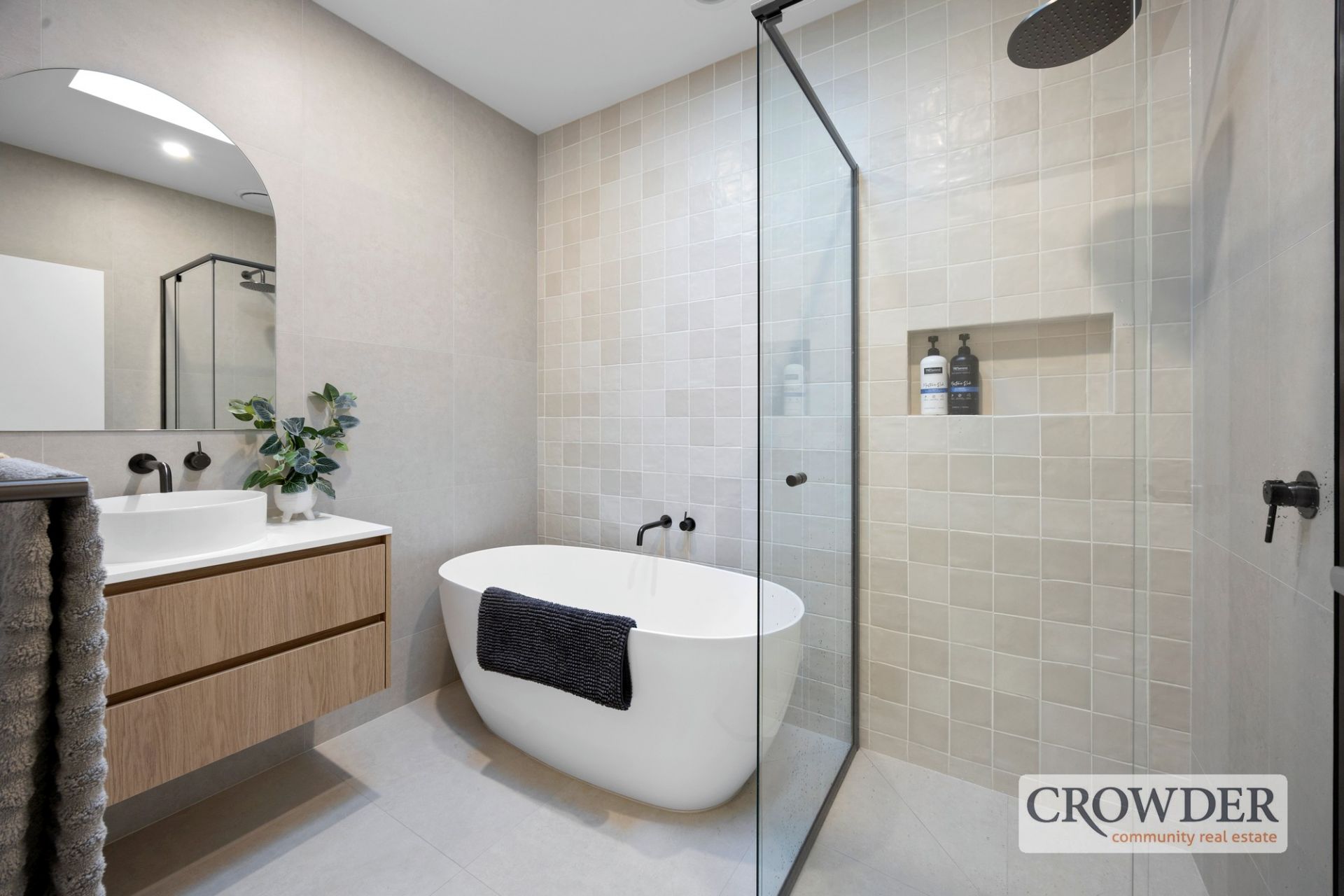 All three bedrooms have north-facing windows for wonderful natural night in this fabulous design, while two stylish bathrooms have giant skylights that also bring sunlight flooding in including the main bathroom with freestanding soaker tub and shower and a main bedroom ensuite with twin vanity, shower and walk-in robe opposite.