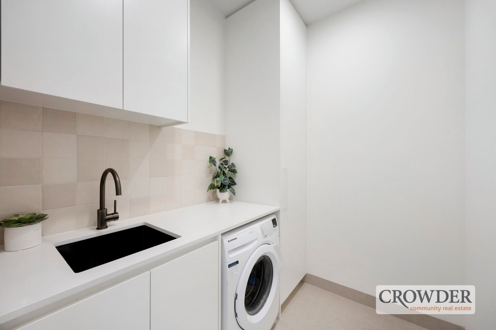 Just 12 months old, designer flair creates stunning spaces throughout featuring an open plan living and dining area moored by a sleek kitchen with white porcelain counters, induction cooktop, oven, dishwasher, soft-closing drawers and timber overheads that match the beautiful oak hybrid floors.