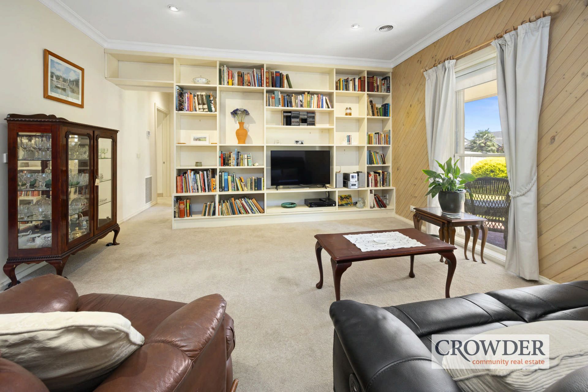The light-filled open living and dining areas are defined by soft tones, timber wall panelling, built-in cabinetry and a relaxed flow through glass French doors to an enchanting private rear garden with tall hedges and a covered alfresco patio to unwind and entertain outdoors.
