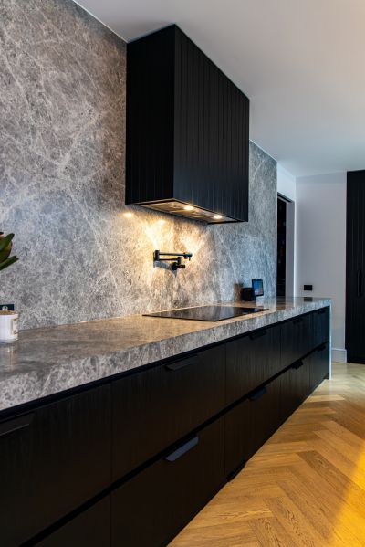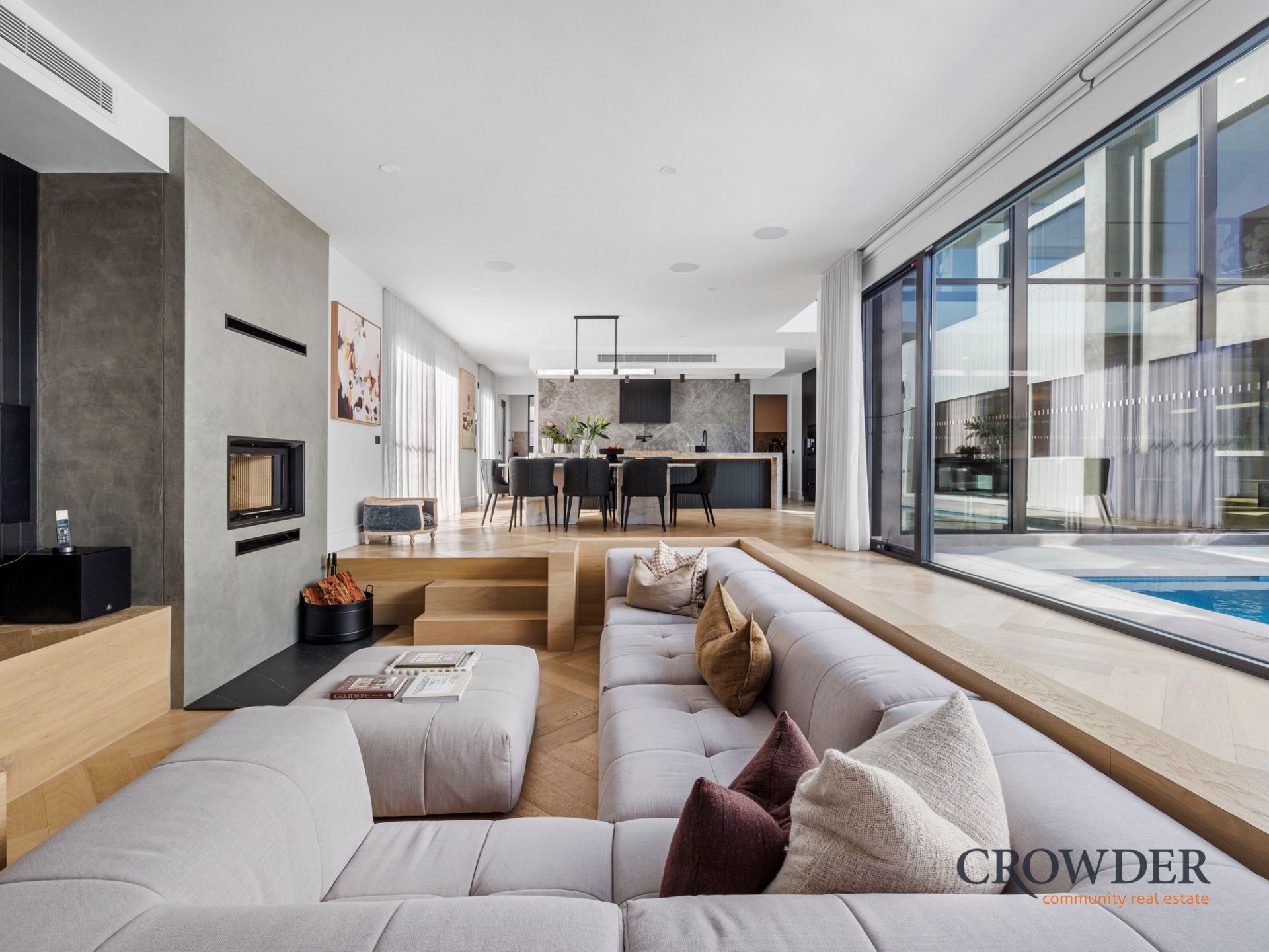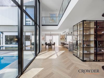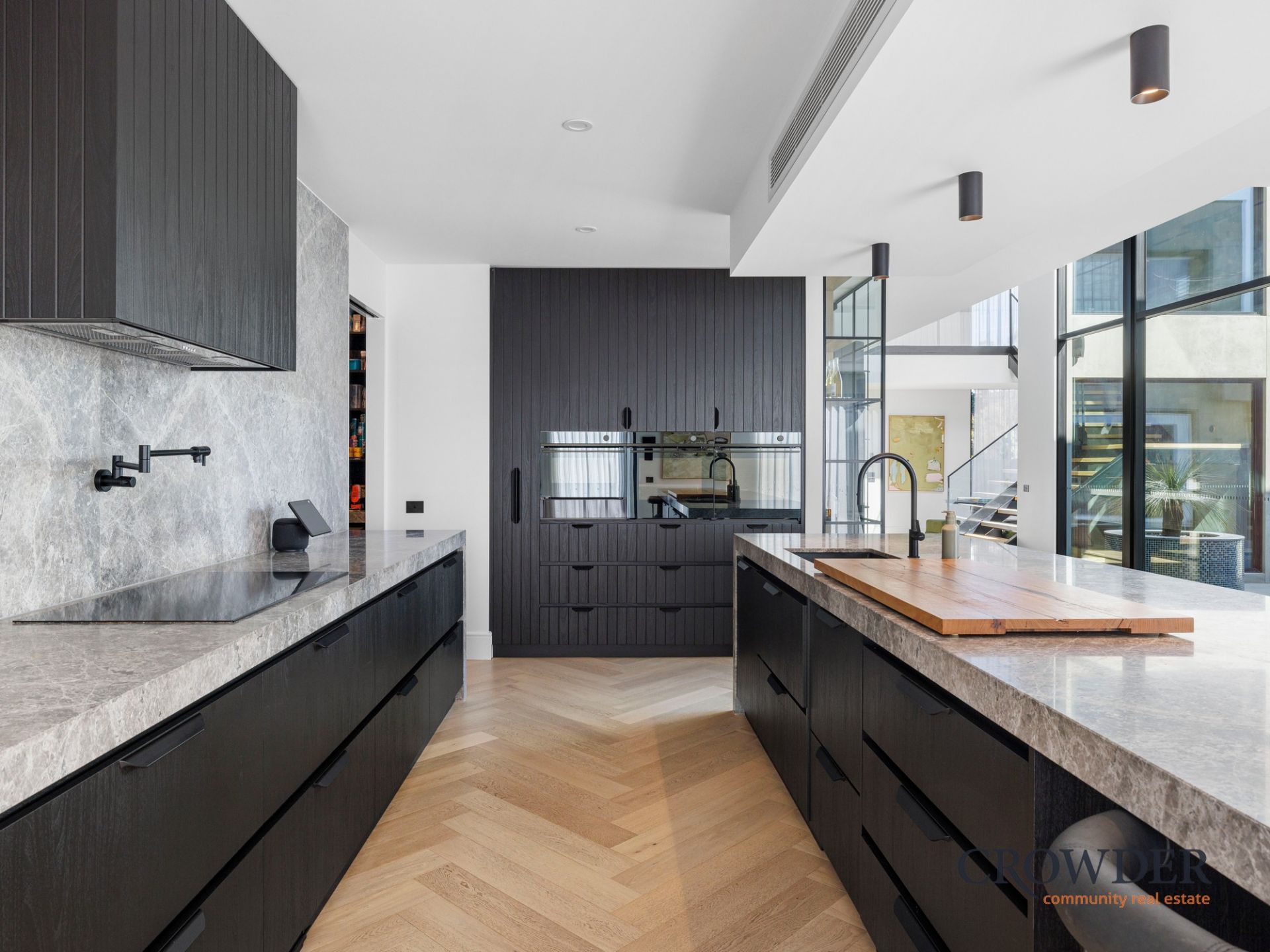 At the heart of the residence a superb kitchen with a vast island bench, butler's pantry, three ovens, two dishwashers, a five-zone induction cooktop and a Zip tap with hot, cold and sparkling water and presides over a dining area large enough for a banquet table so all the family can gather.