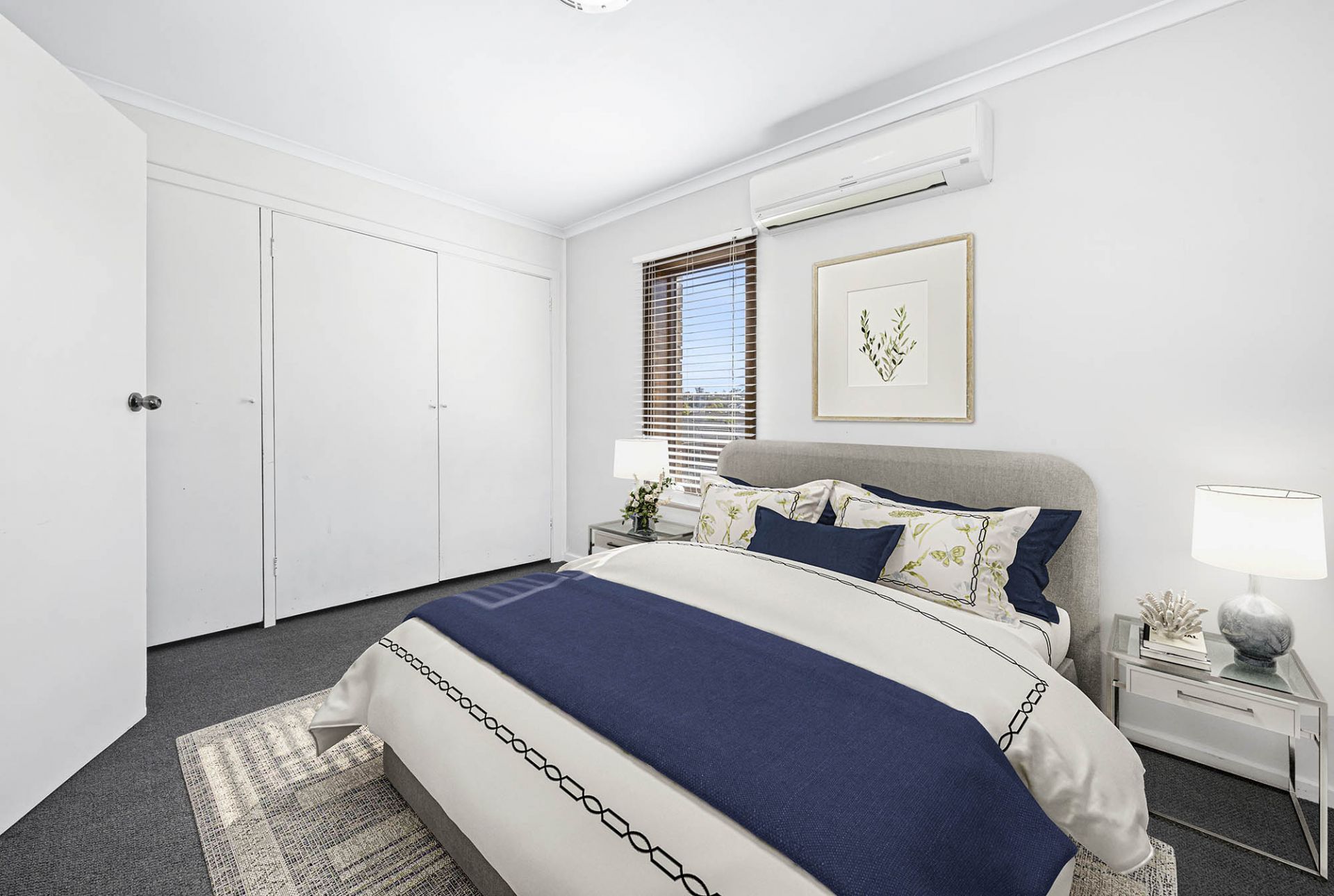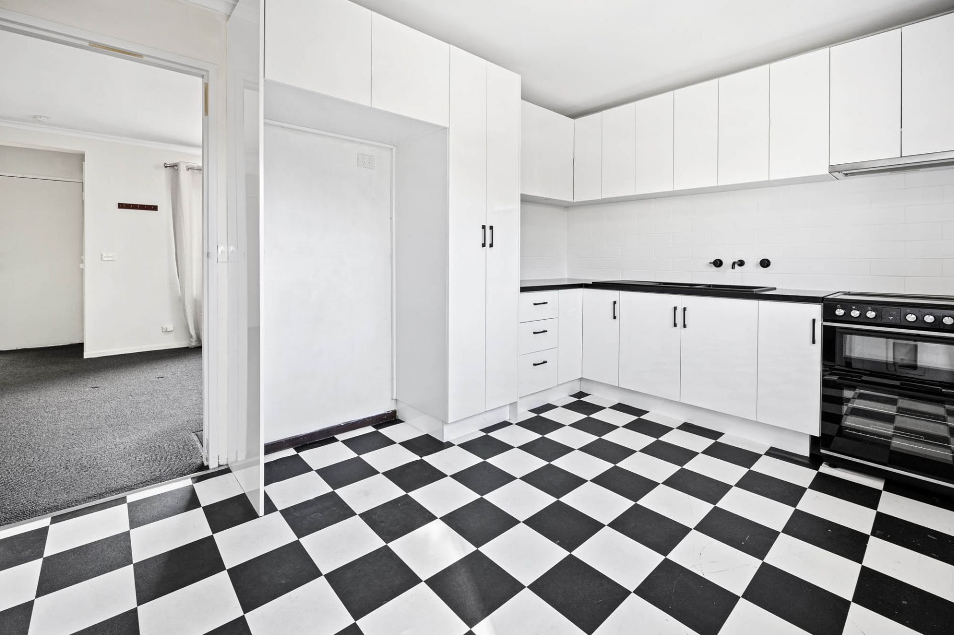Privately positioned within a boutique group of just 12 homes, the residence has been tastefully refurbished to provide stylish, low maintenance living. A generous lounge with near-new carpet flows to a meals area and a striking monochrome kitchen featuring stone benchtops, soft-close cabinetry, matt black tapware and statement black-and-white chequerboard tiles.