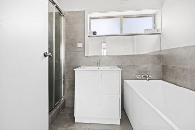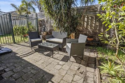 Privately positioned within a boutique group of just 12 homes, the residence has been tastefully refurbished to provide stylish, low maintenance living. A generous lounge with near-new carpet flows to a meals area and a striking monochrome kitchen featuring stone benchtops, soft-close cabinetry, matt black tapware and statement black-and-white chequerboard tiles.