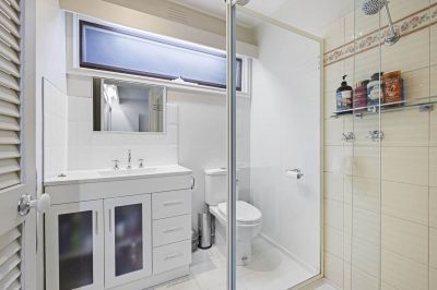 On the mid-level is a spacious lounge room while downstairs are 2 more bedrooms including one with a pair of walk-in robes and another with an ensuite bathroom, as well as a rumpus room leading out to a brick-paved entertaining patio and a large meals and living area with a second kitchen and a double-door entrance from the double carport - ideal for independent living or as a home office.