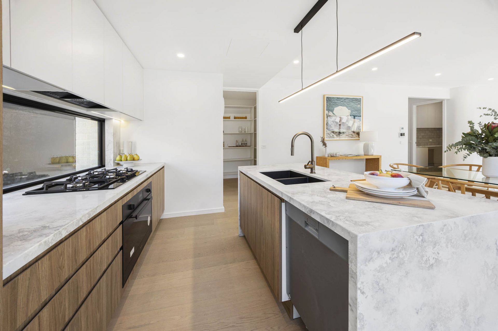 At the heart of the home lies a stunning stone-topped chef's kitchen, complete with integrated Artusi and Bosch appliances, a generous walk-in pantry, and sleek cabinetry that blends practicality with elegance. A guest powder room adds convenience, while timber flooring throughout adds warmth and texture to the modern design.