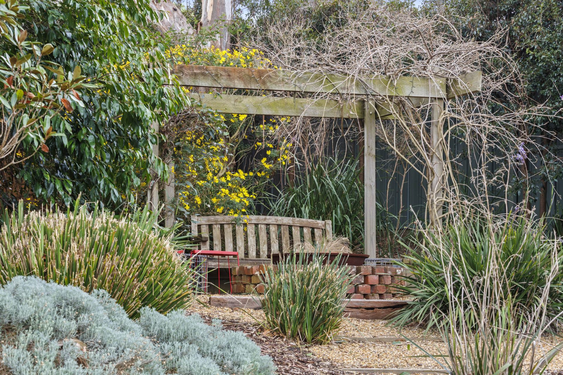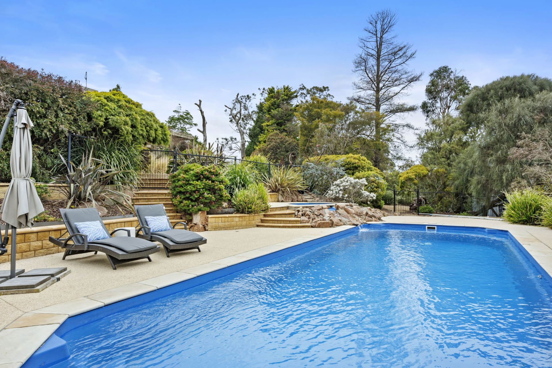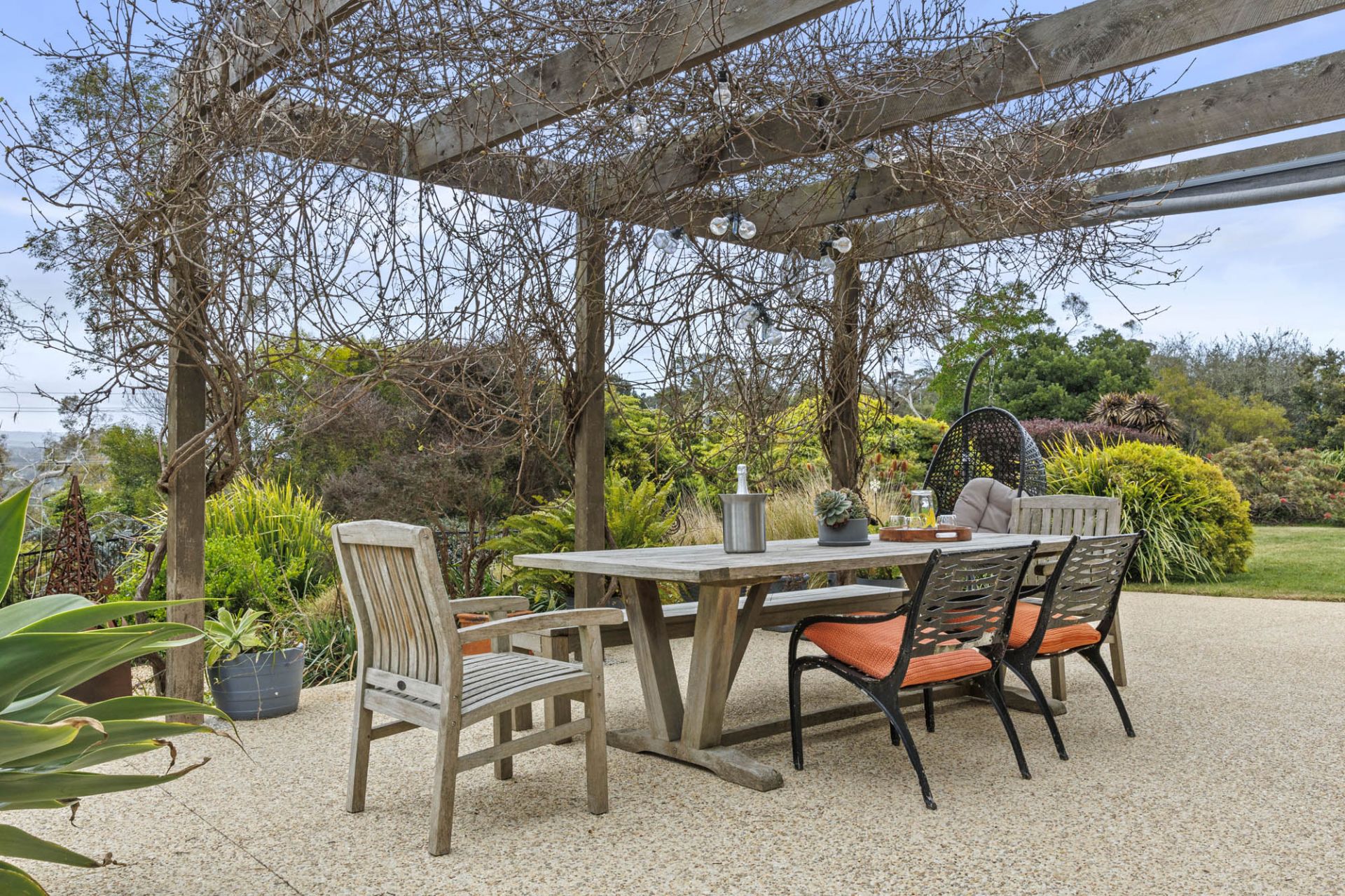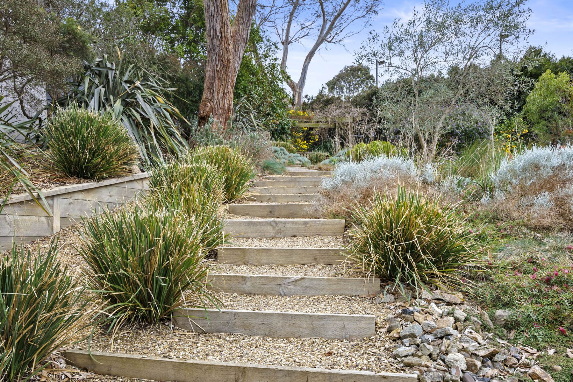 Rear gardens have steps leading up to a quaint firepit zone set at the highest point of the property where you can indulge in an evening red and enjoy a sensational panoramic vista over the peninsula's Moorooduc Plains that turn into a dazzling light show as day turn to dusk.