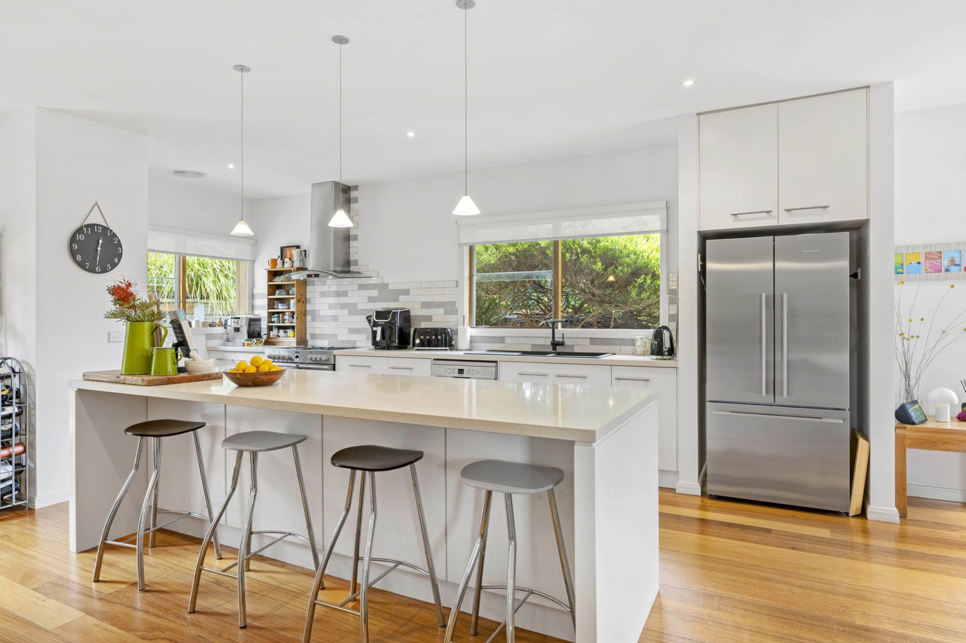 Inside, an elegant open plan living and dining area is anchored by an impressive stone-topped kitchen beautifully appointed with a Belling stove, Bosch dishwasher and soft-close cabinetry. Concertina glass doors giving easy access to the alfresco terrace, while double doors let dining area open to a rear terrace.