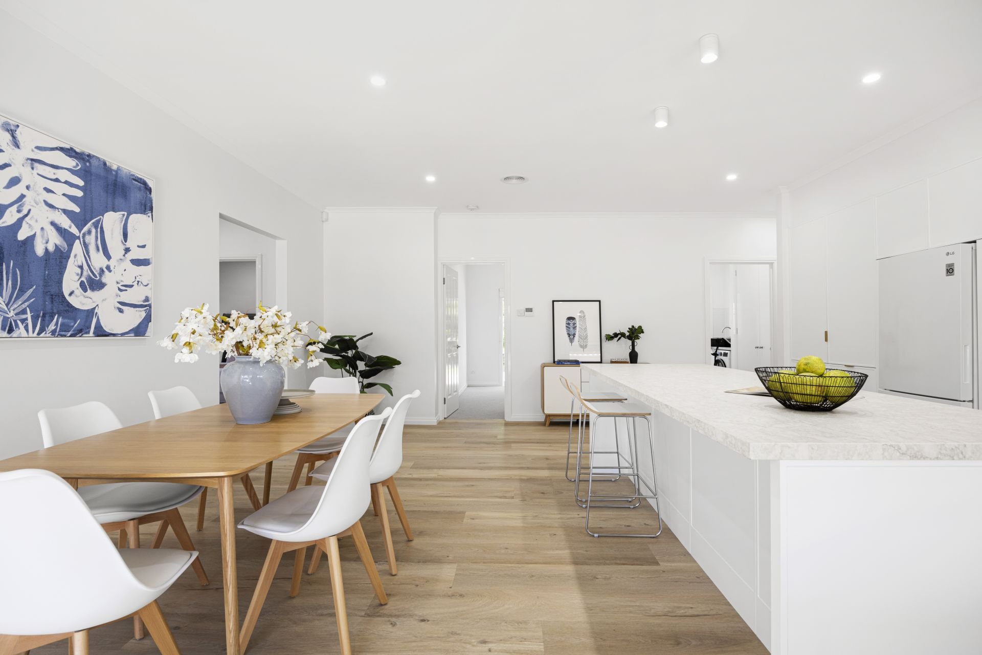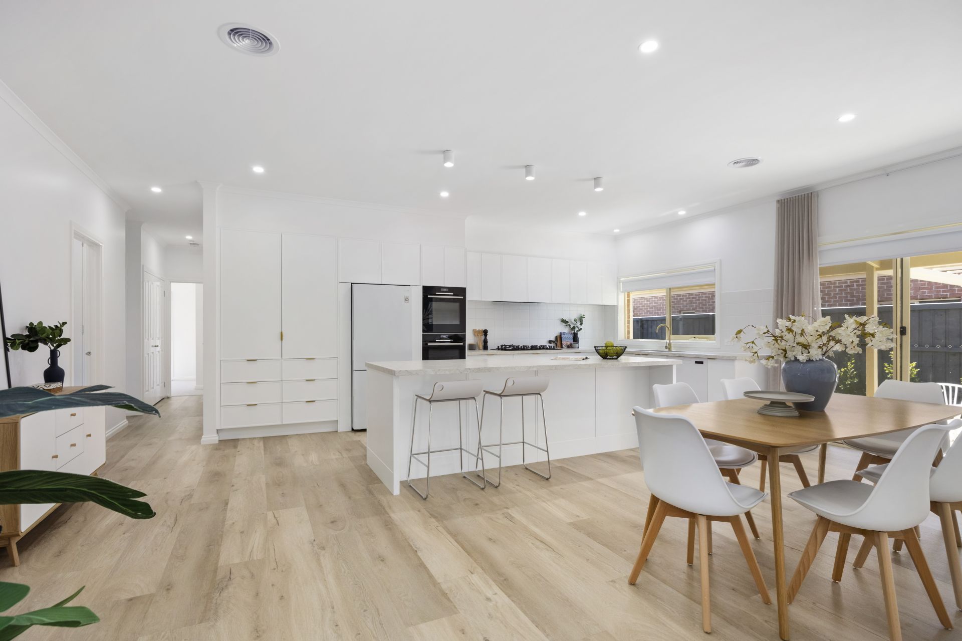A stone-topped kitchen forms the show-stopping heart of the home ideal for the avid entertainer with two Bosch ovens, Bosch cooktop and Schweigen rangehood, while a long stone island is superb for serving up pre-dinner drinks and nibbles.