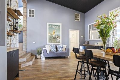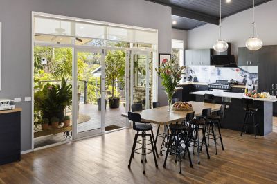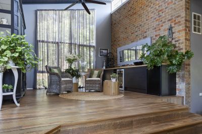 The kitchen heroes in the showstopping heart of the home with Smeg vintage stove, a Banksy-inspired glass splashback, a stone island highlighted by spectacular pendant lights above. A contemporary mural-style artwork painted directly onto an exposed brick wall provides a chic industrial aesthetic presiding over the open plan dining and family room, while double glass doors open out to a choice of covered and open alfresco decks overlooking the lap pool where a poolside pavilion lets you indulge in resort-style luxury.