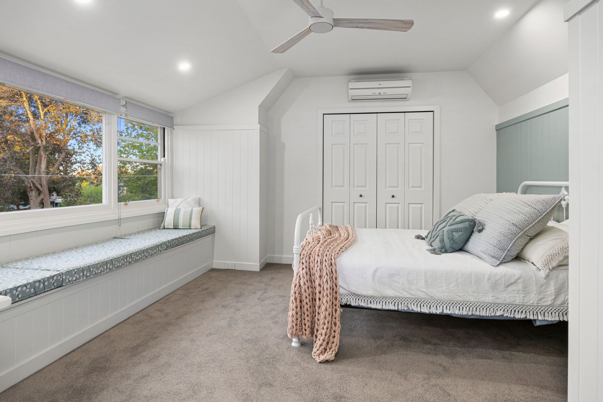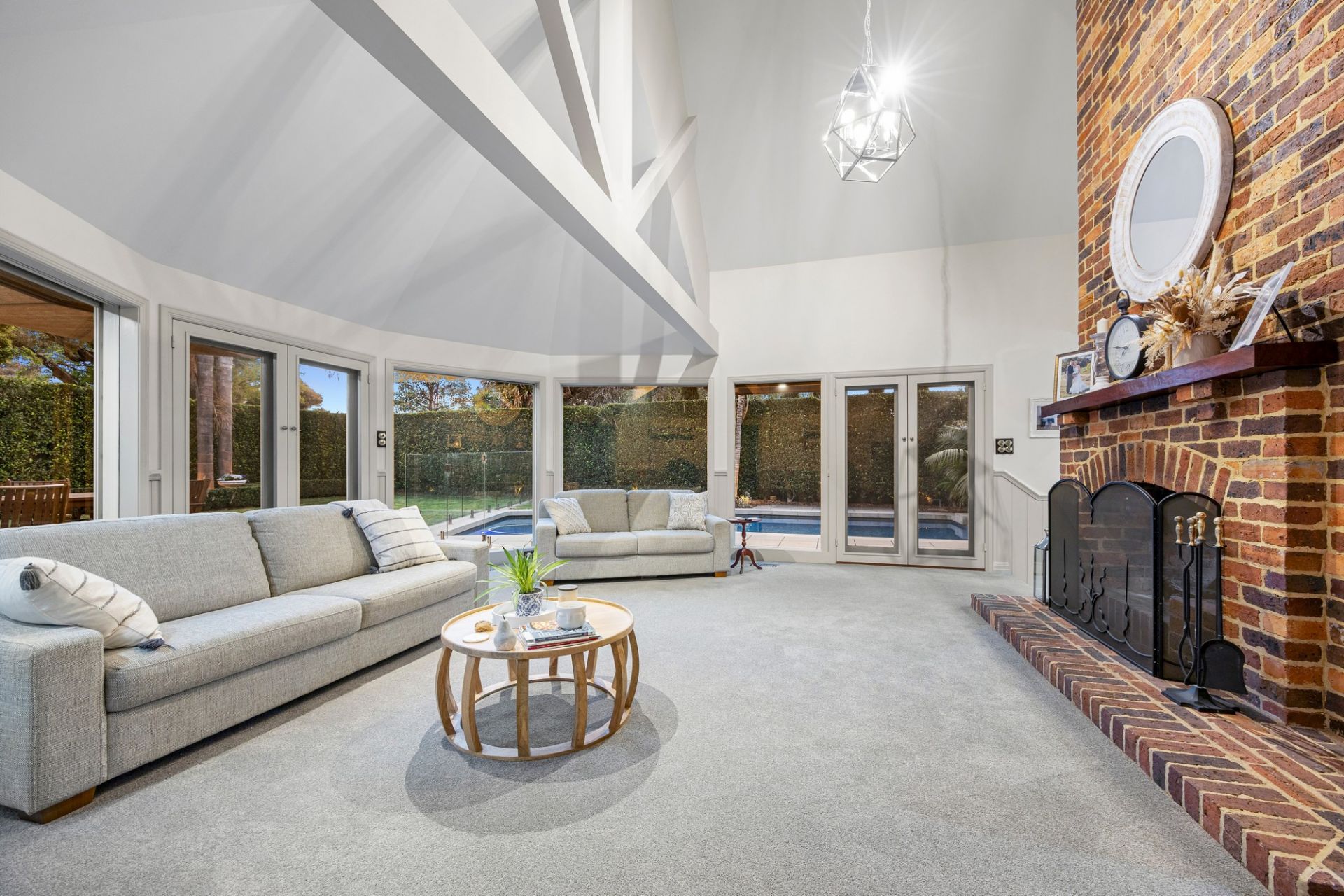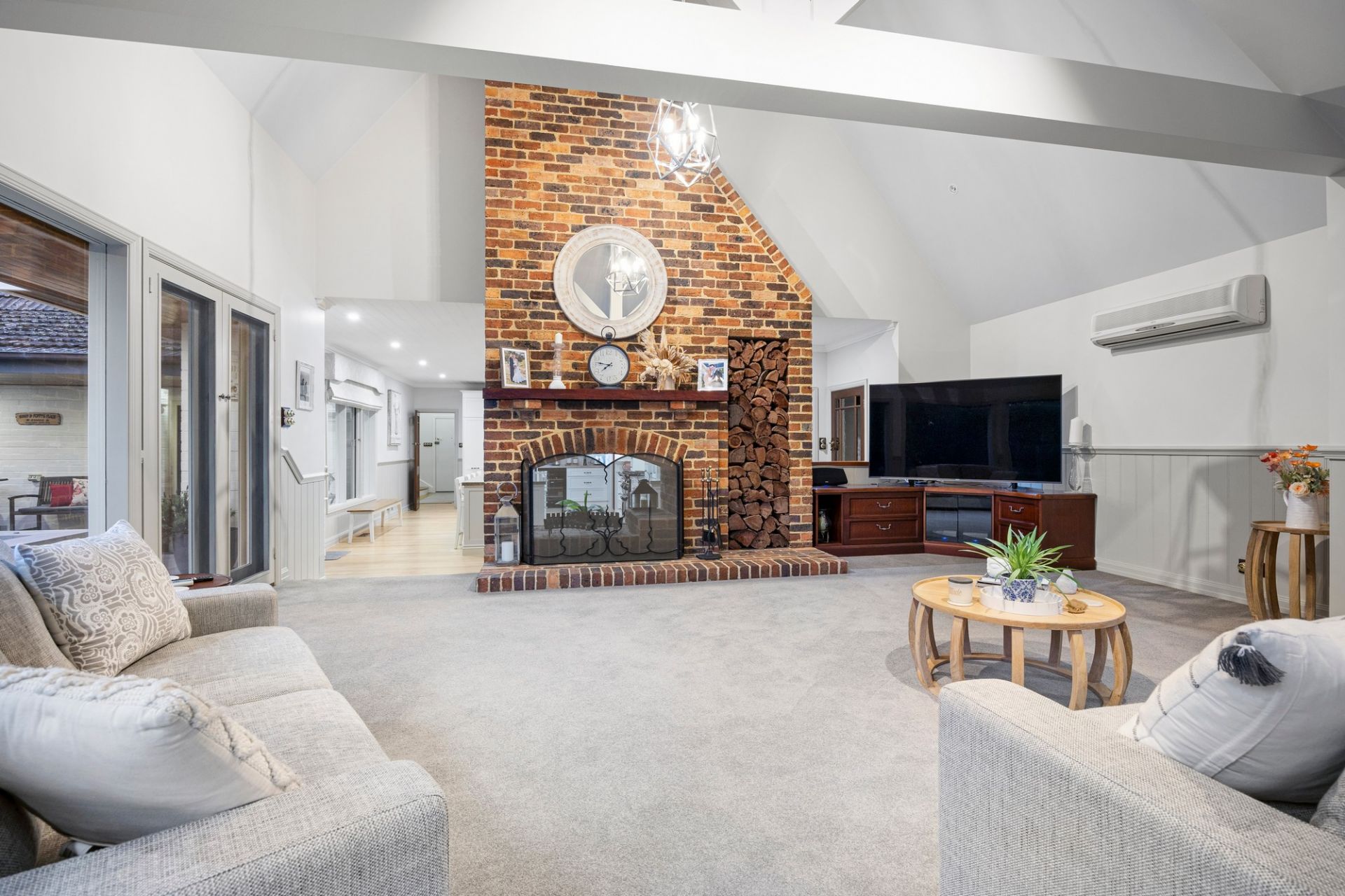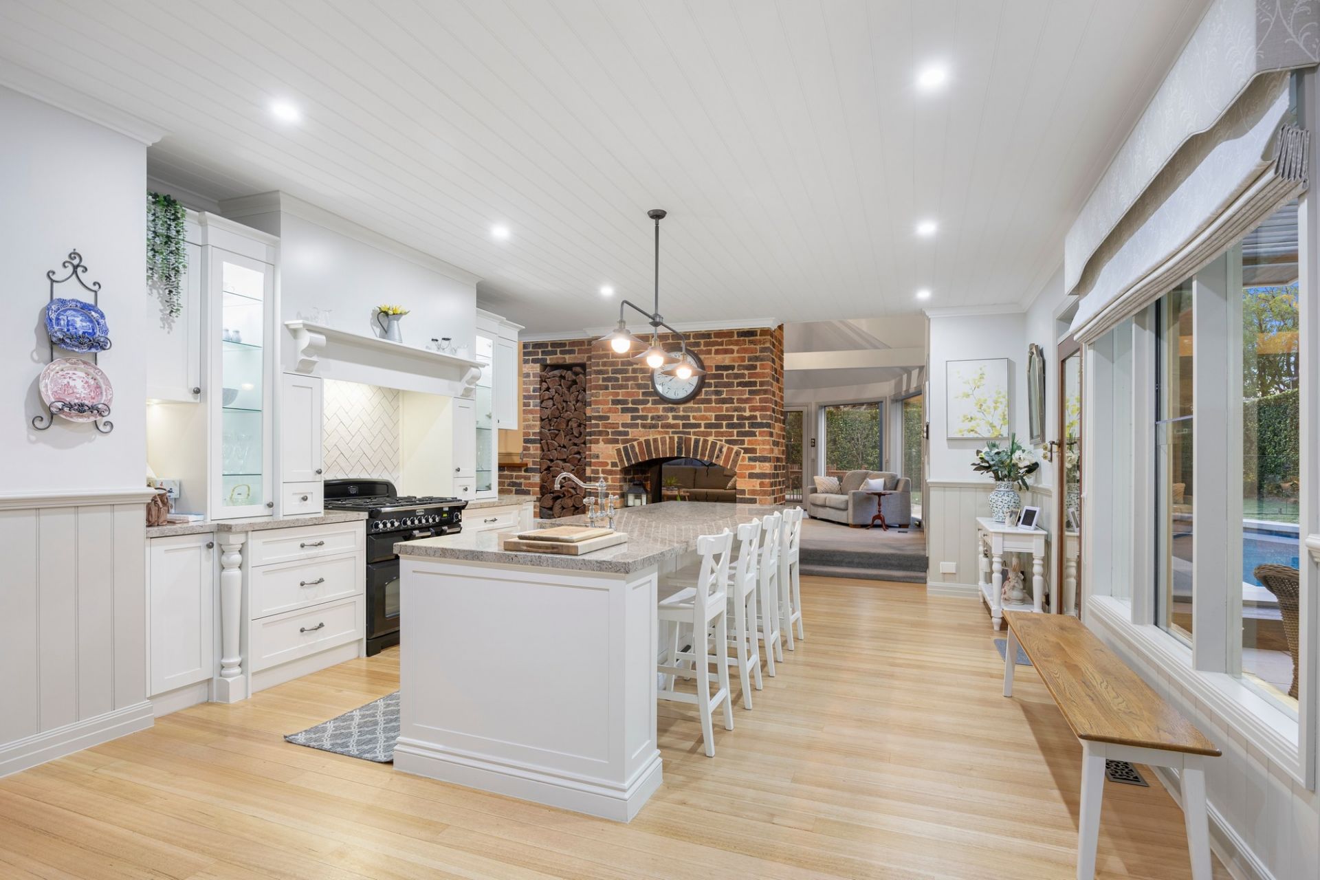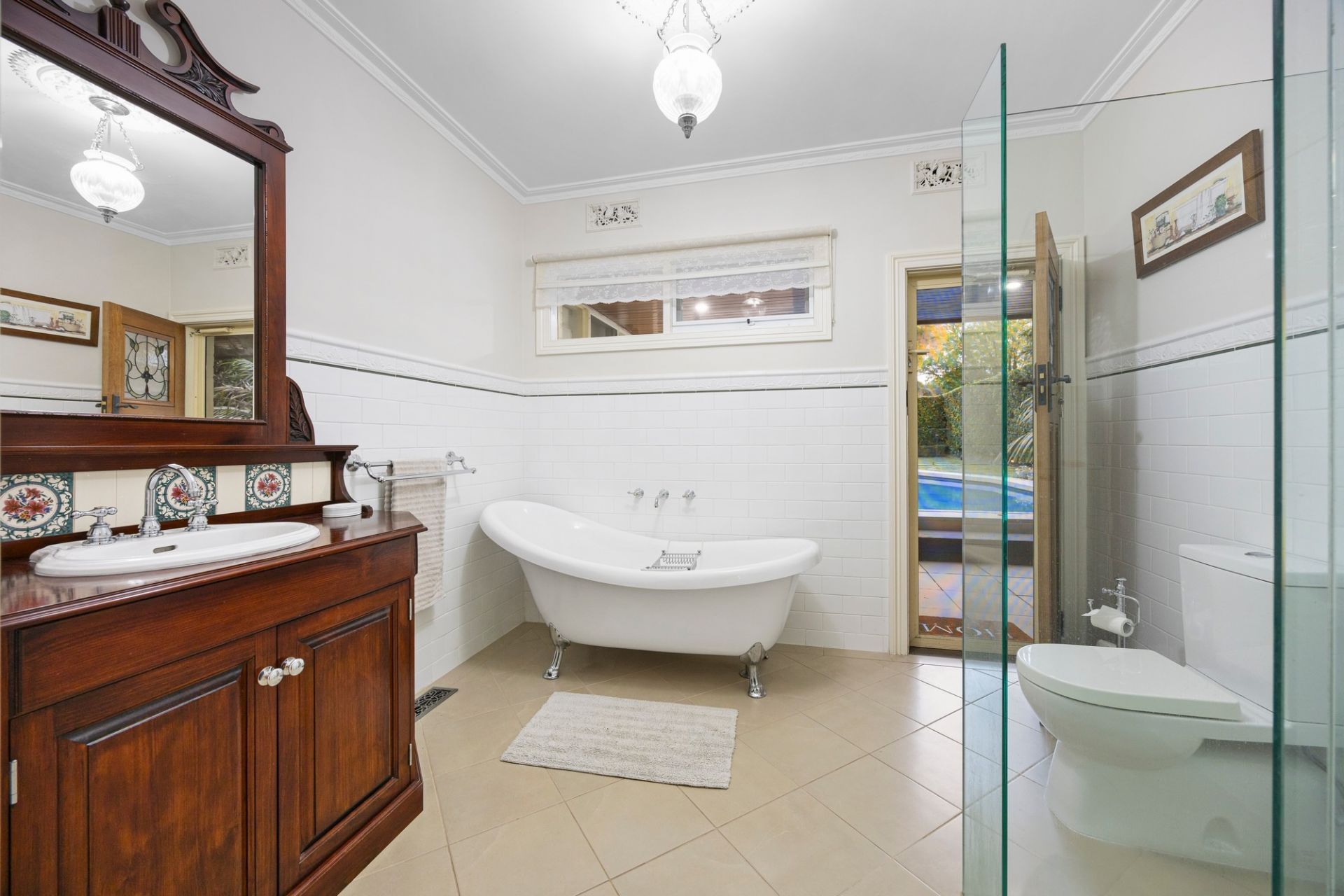 Up a split staircase, the sleeping quarters feature a luxe main bedroom suite including an open fire, a treetop balcony looking directly over the pool and a sleek ensuite with arched mirrors over a twin vanity, freestanding pod bath and large shower. A second bedroom has a walk-in robe and large window seat, a 3rd bedroom has an adjoining play area, while the 4th bedroom sits beside the period-style family bathroom with clawfoot bath, shower and convenient pool access.