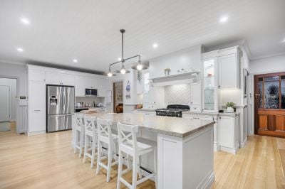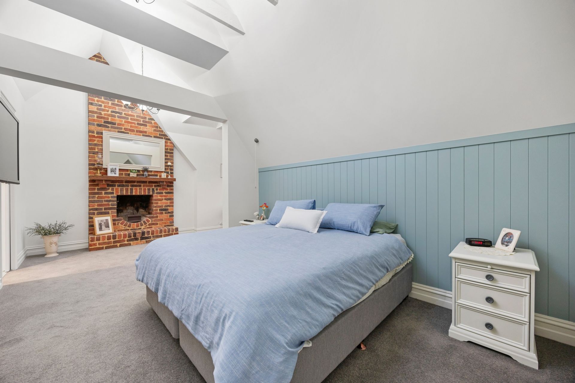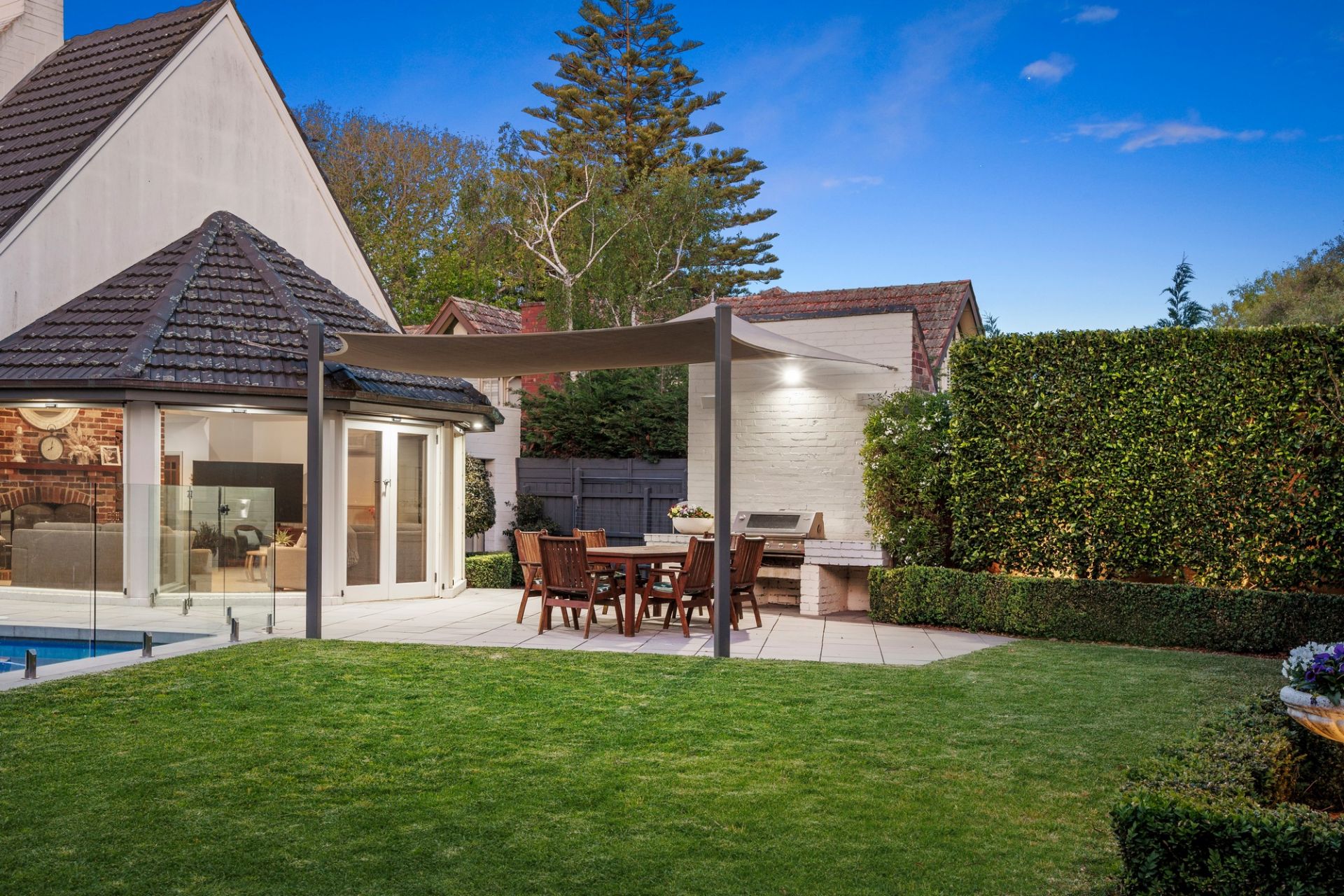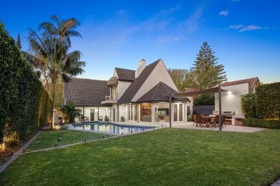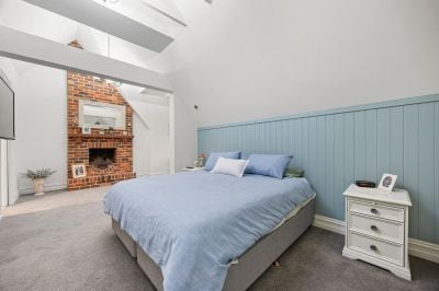 Up a split staircase, the sleeping quarters feature a luxe main bedroom suite including an open fire, a treetop balcony looking directly over the pool and a sleek ensuite with arched mirrors over a twin vanity, freestanding pod bath and large shower. A second bedroom has a walk-in robe and large window seat, a 3rd bedroom has an adjoining play area, while the 4th bedroom sits beside the period-style family bathroom with clawfoot bath, shower and convenient pool access.