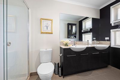 Also downstairs is a 3rd bedroom served by a powder room and combined laundry and bathroom as well as internal access to the remote double garage, while upstairs the generous main bedroom includes an ensuite with twin vanities and large shower, a second living area, another bedroom with built-in robes and the main bathroom featuring a separate toilet.