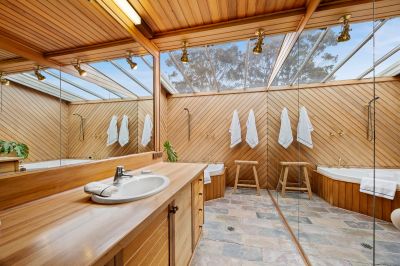 Full-height windows frame glorious green vistas throughout, while 3 substantial living domains provide exceptional flexibility for refined entertaining and everyday living. The main lounge is anchored by a spectacular curved batten-timber feature wall and gas fireplace, the central family room easily accommodates an impressive dinner party setting with double doors opening to the terrace, and the rumpus room brings a sense of occasion with its dome fireplace and wet bar.
