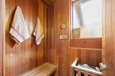 Tucked privately to the rear and wrapping the courtyard, the accommodation wing comprises 5 generous bedrooms, including a main suite with dressing room and 2-way ensuite, a cedar family bathroom with corner bath, and a dedicated sauna room with shower. Two separate studies, thoughtfully positioned off the living zones, further enhance the home's versatility.