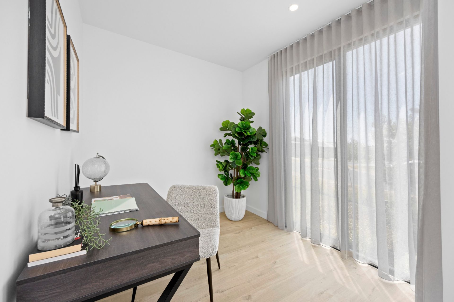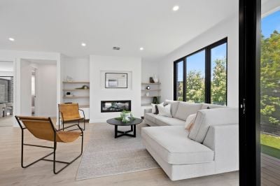 With thoughtful design and broad lifestyle appeal for first-home buyers, families, professionals and downsizers alike, the floorplan wraps around a central open plan living and dining area with a flickering electric fireplace and two sets of corner glass sliding doors that peel back to expand the area into a covered alfresco deck.