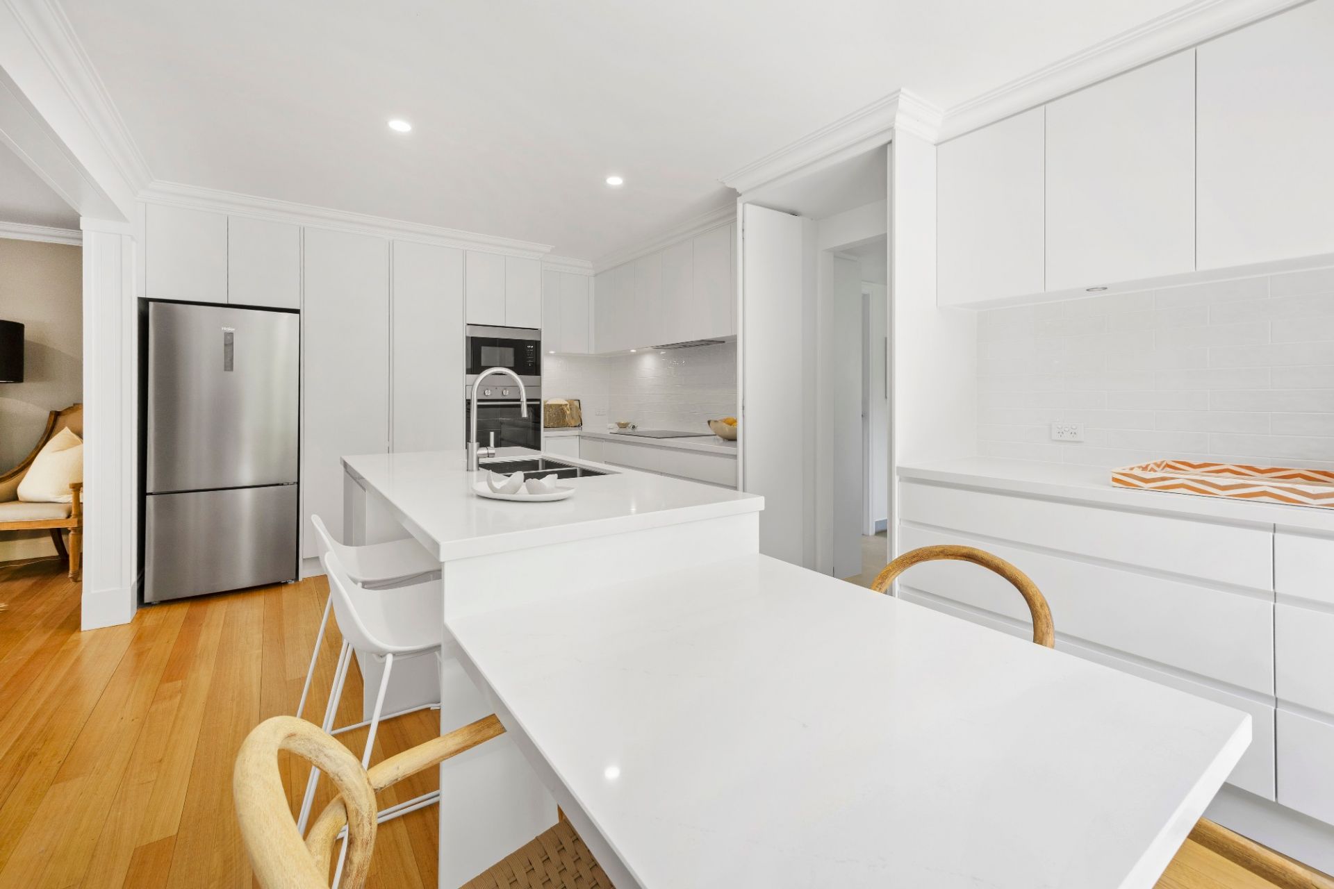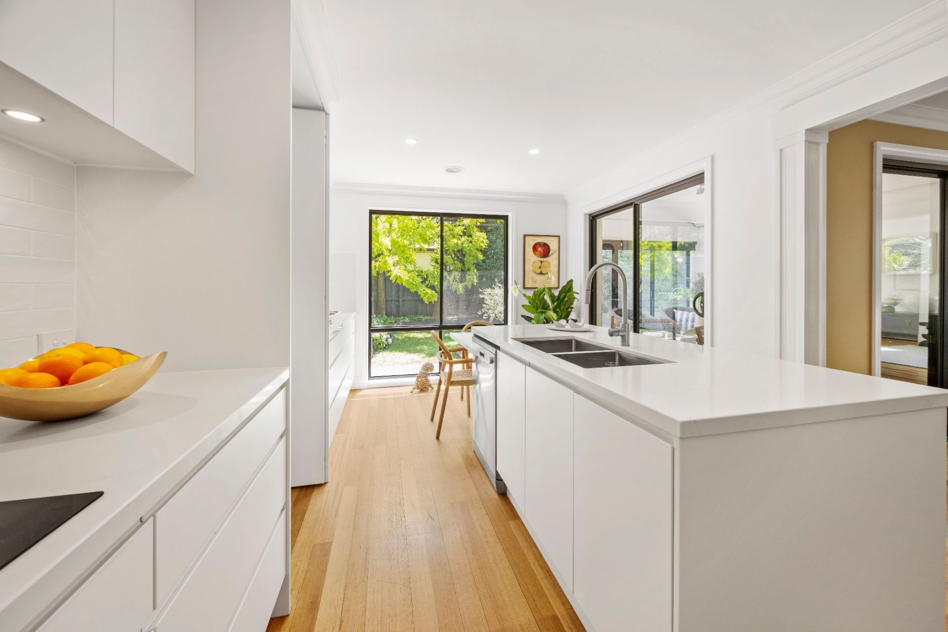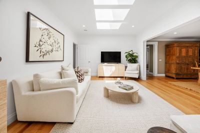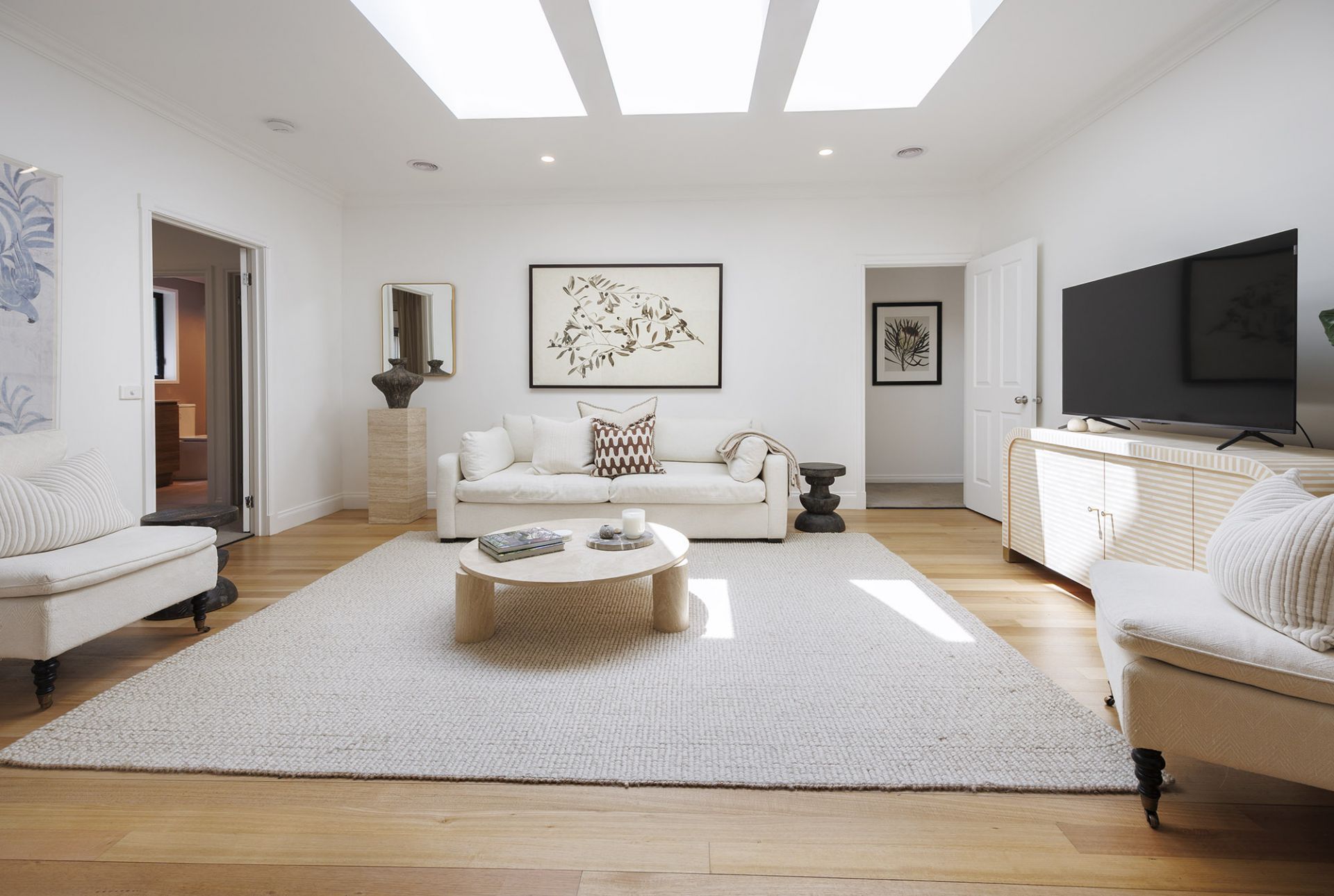The main bedroom forms a peaceful retreat, complete with a chic ensuite and walk-in robe, while the remaining bedrooms are beautifully serviced by a striking new family bathroom and powder room, with designer twin vanity, arched mirrors and another statement skylight that brings a sense of boutique-hotel indulgence.