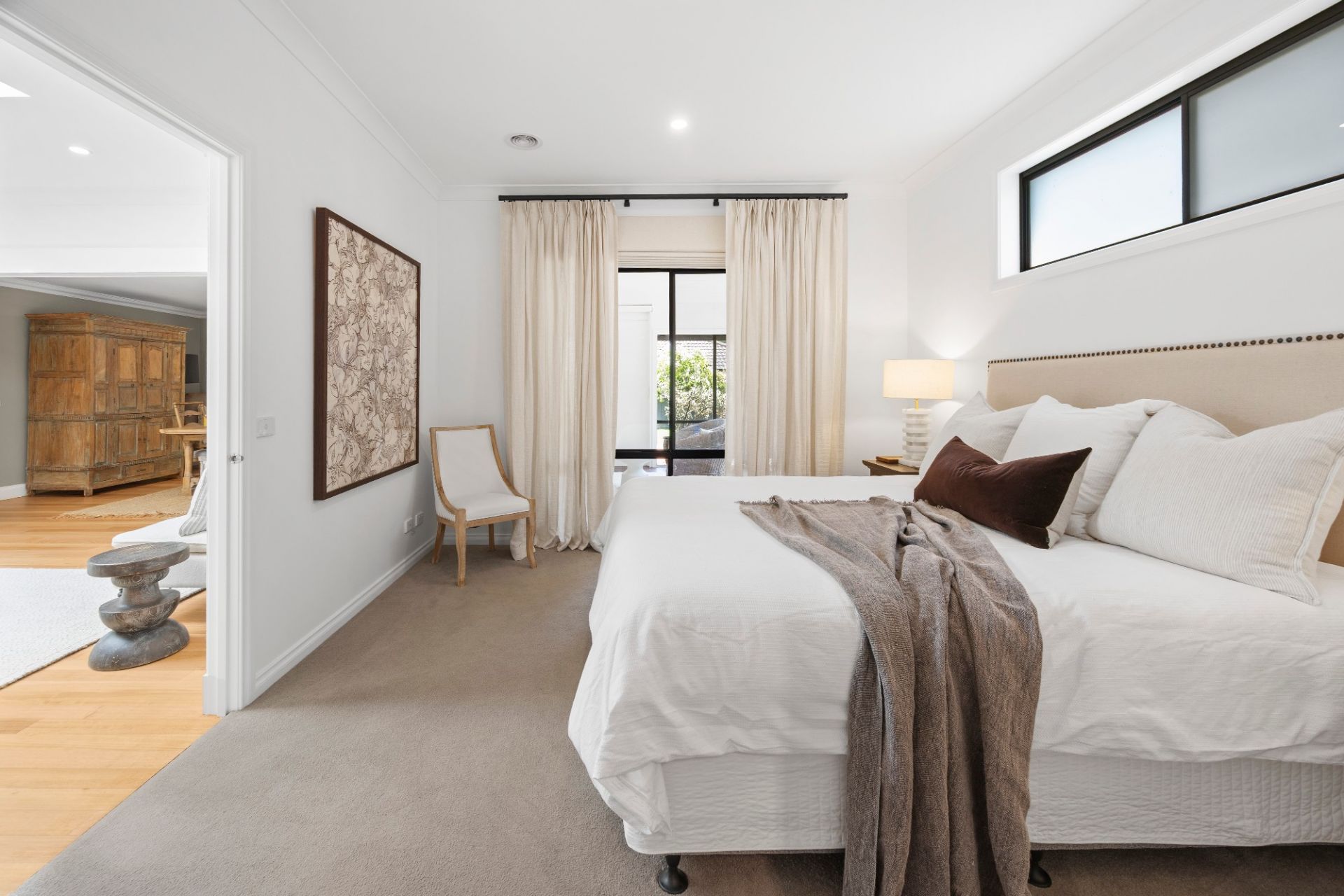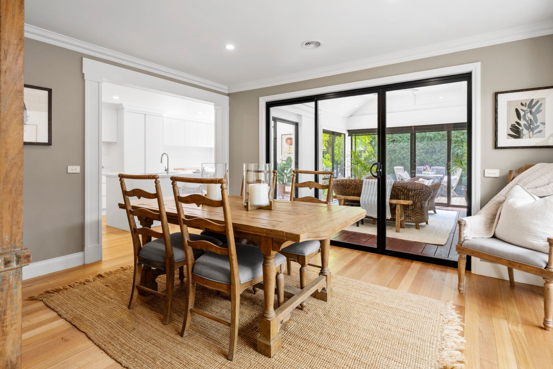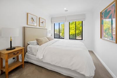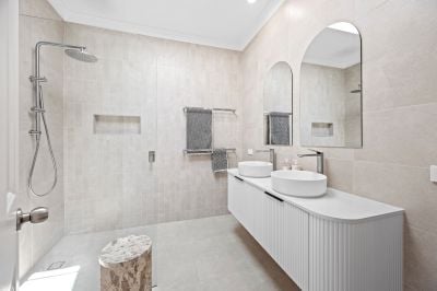 The main bedroom forms a peaceful retreat, complete with a chic ensuite and walk-in robe, while the remaining bedrooms are beautifully serviced by a striking new family bathroom and powder room, with designer twin vanity, arched mirrors and another statement skylight that brings a sense of boutique-hotel indulgence.