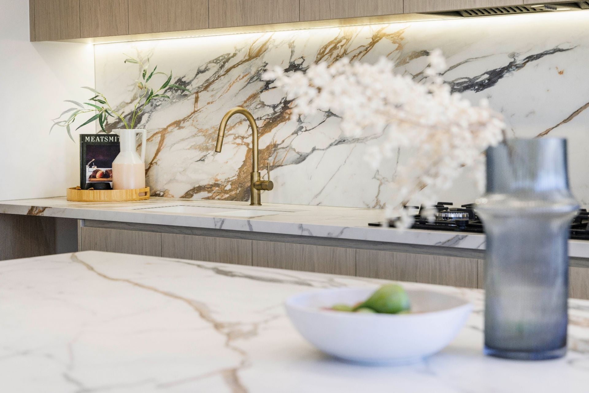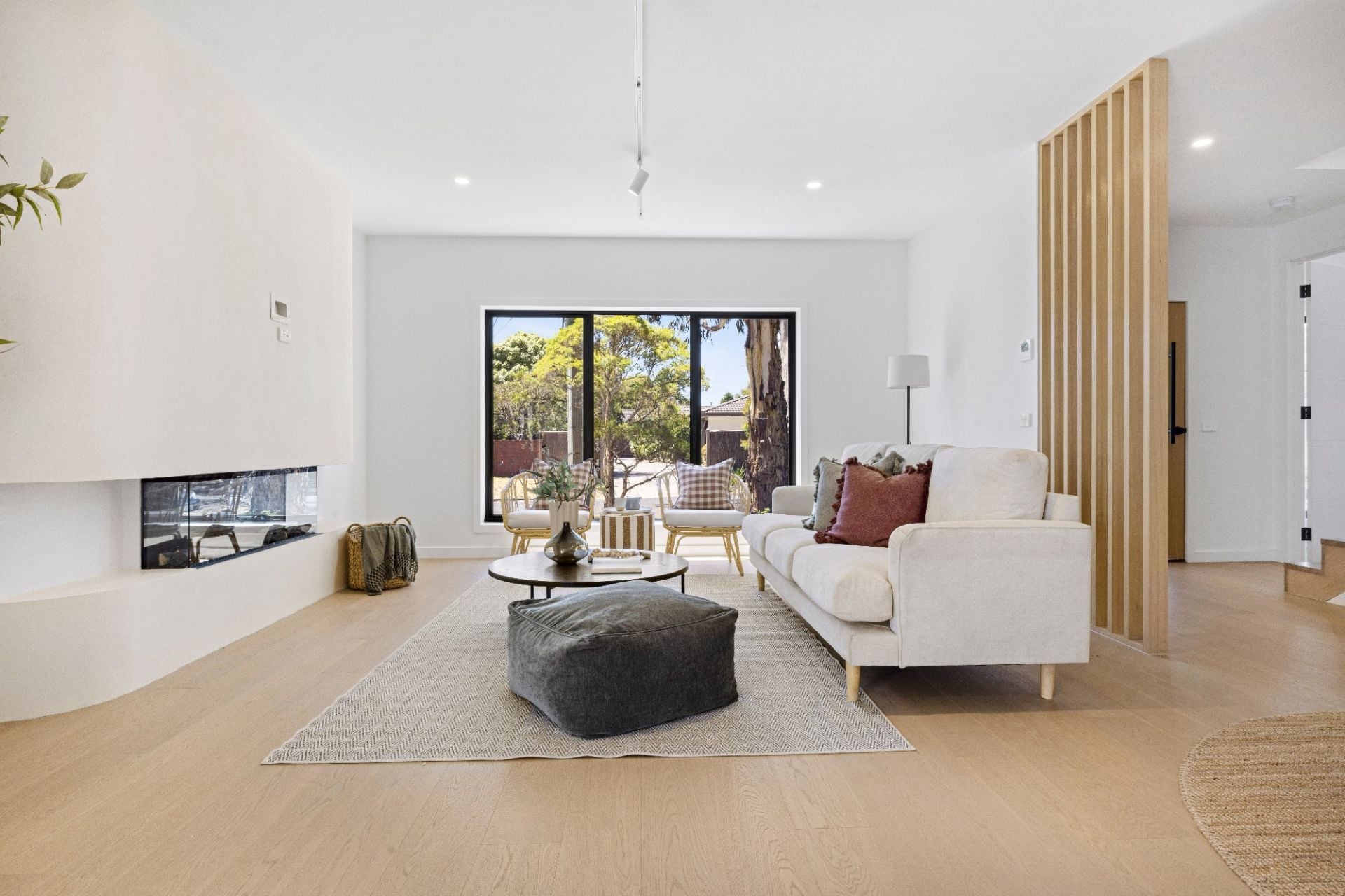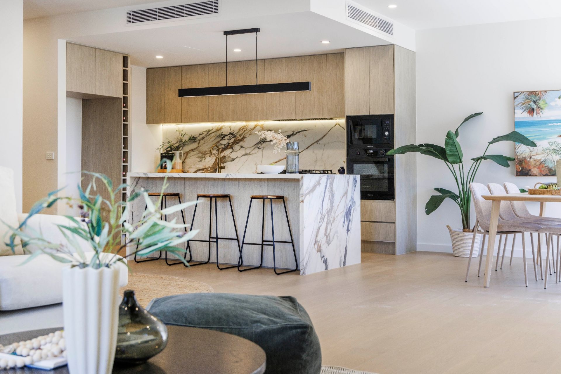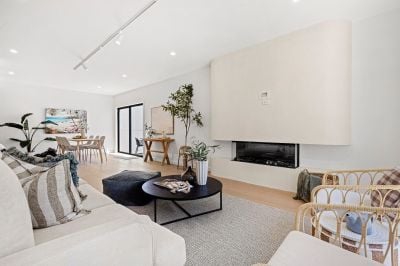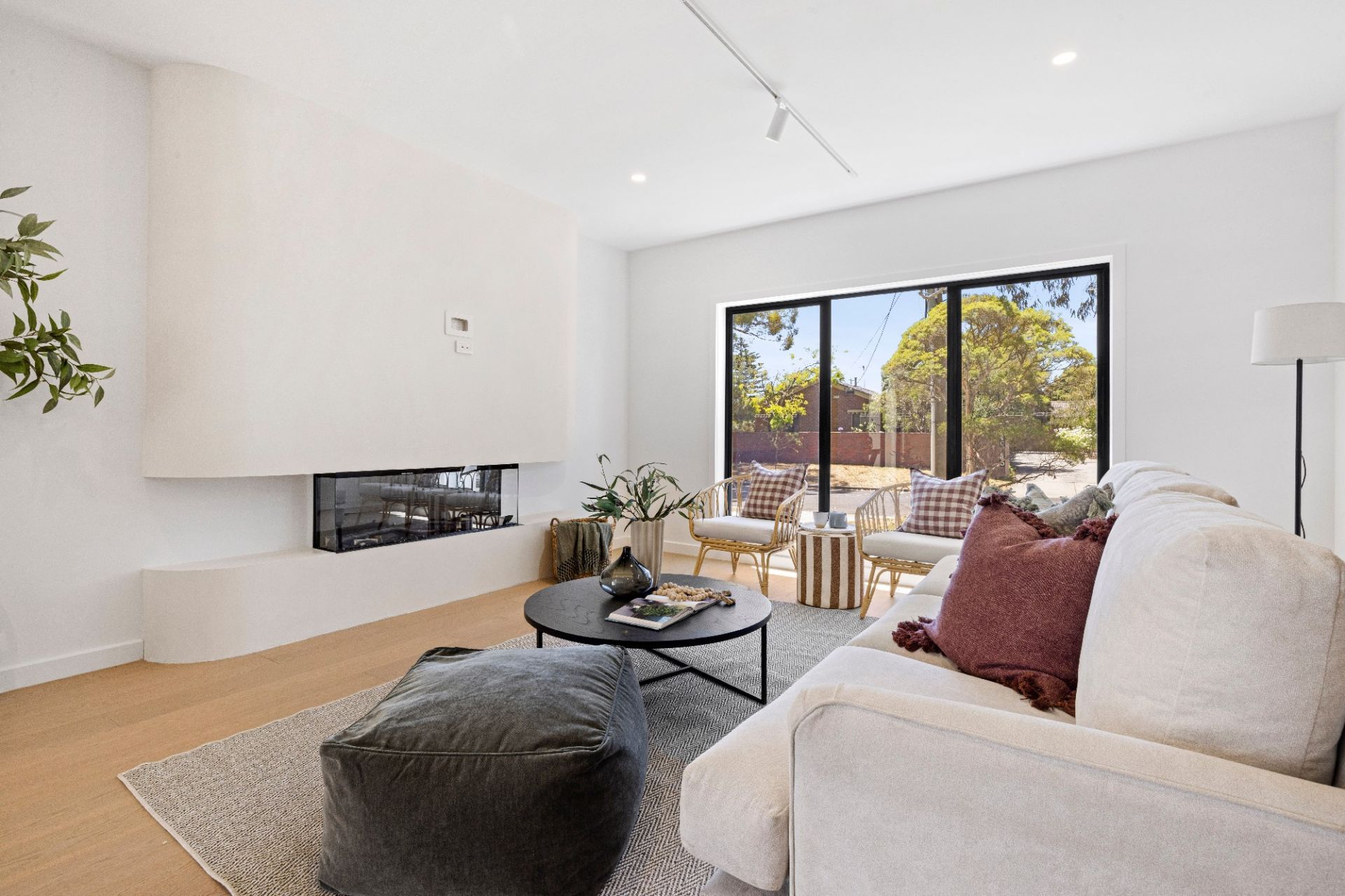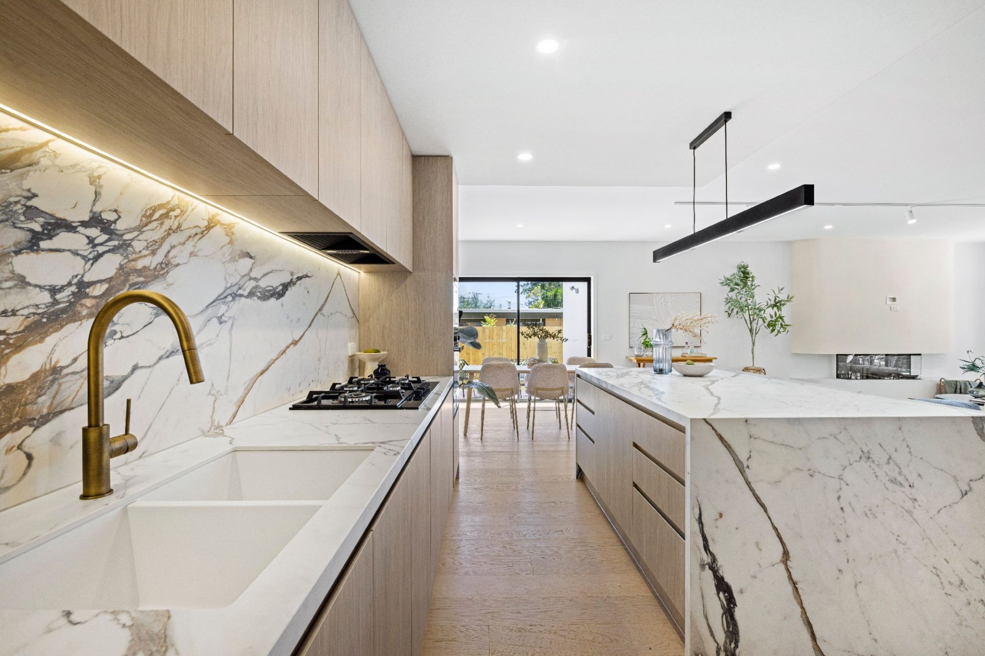 Inside, a vast open-plan living domain makes an immediate statement. Anchored by a gas fireplace framed within a sculptural curved surround, the space is complemented by engineered oak floors and a glamorous showpiece kitchen featuring marble-look stone benchtops and splashbacks, quality appliances and a walk-in pantry.