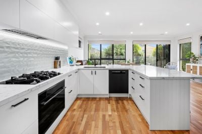 With Tasmanian myrtle floorboards, the stone-topped kitchen pairs architectural simplicity with exceptional functionality, featuring touch-to-open overhead cabinetry with seamless lines, premium soft-closing Blum joinery with designer hardware, a 900mm oven, gas cooktop and Bosch dishwasher, while the adjoining open plan living and dining domain has a whole wall of glass and sliding doors opening to the sunlit alfresco terrace embraced by the towering hedges.