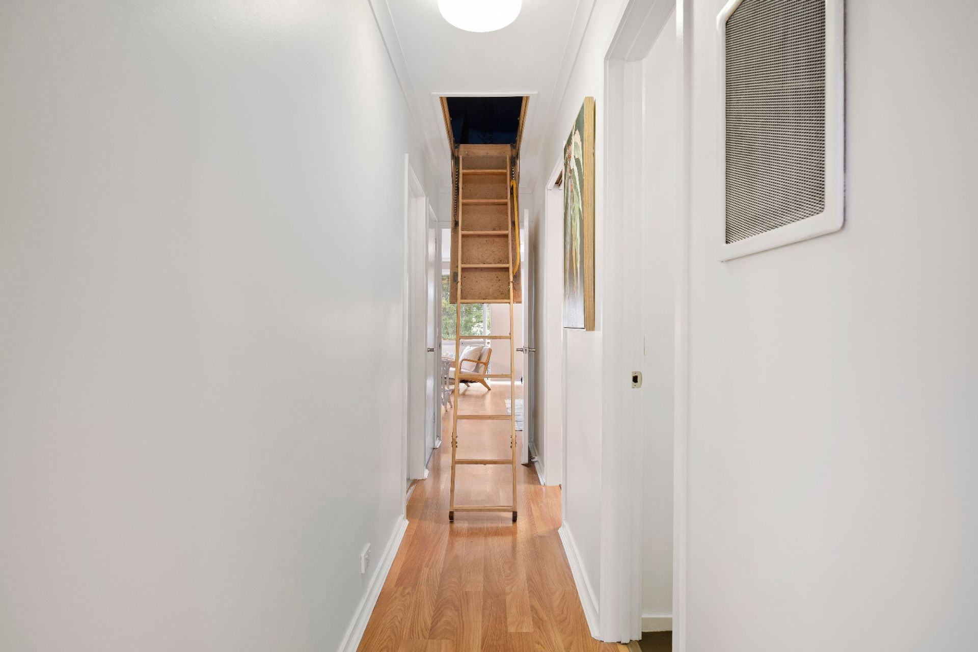 Down the hall are 2 generous bedrooms each with a full wall of full-height mirrored robes delivering an extra sense of space, while the bathroom has an oversized shower, feature penny tiles and mirrored cabinets over the vanity.