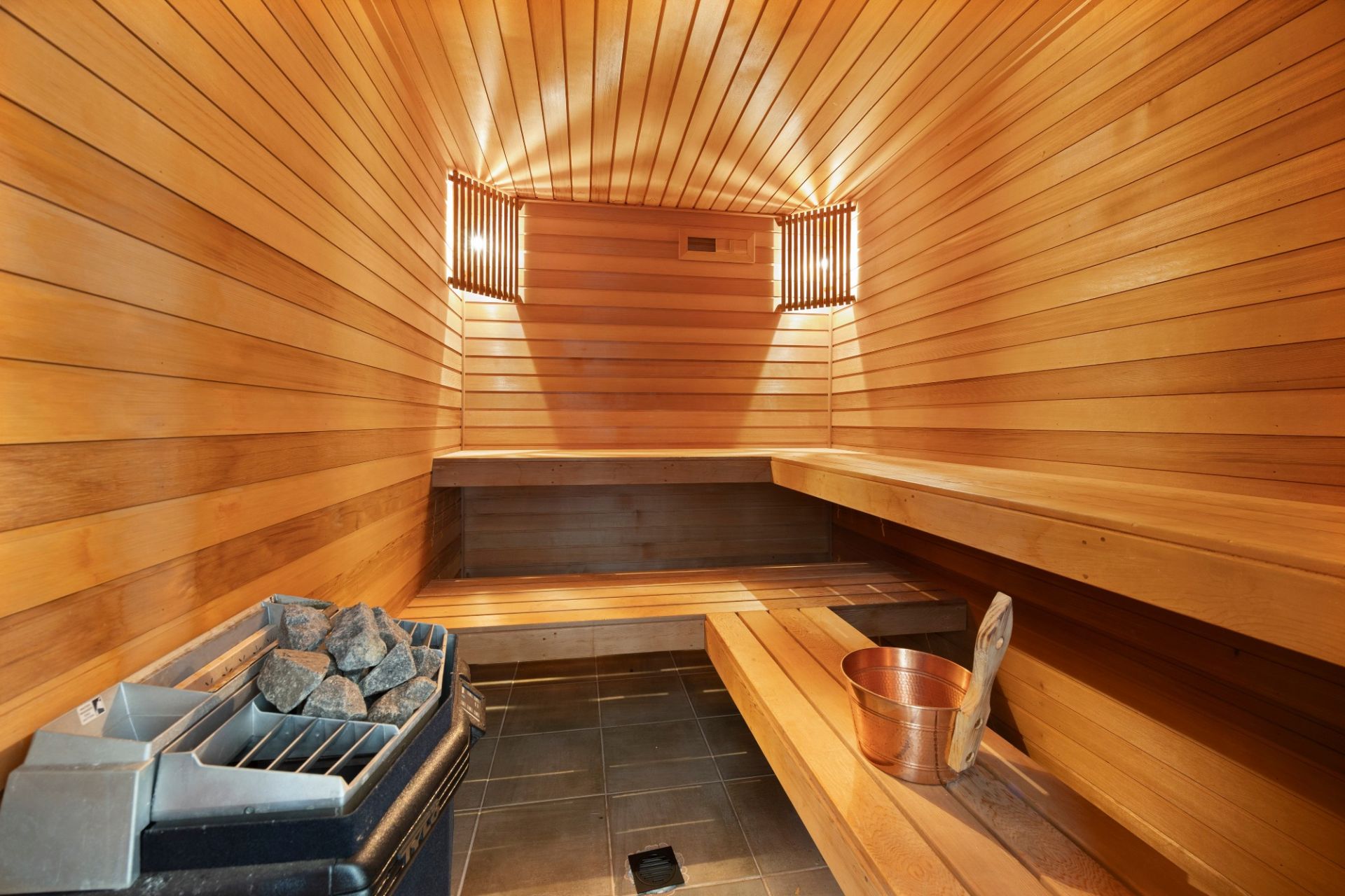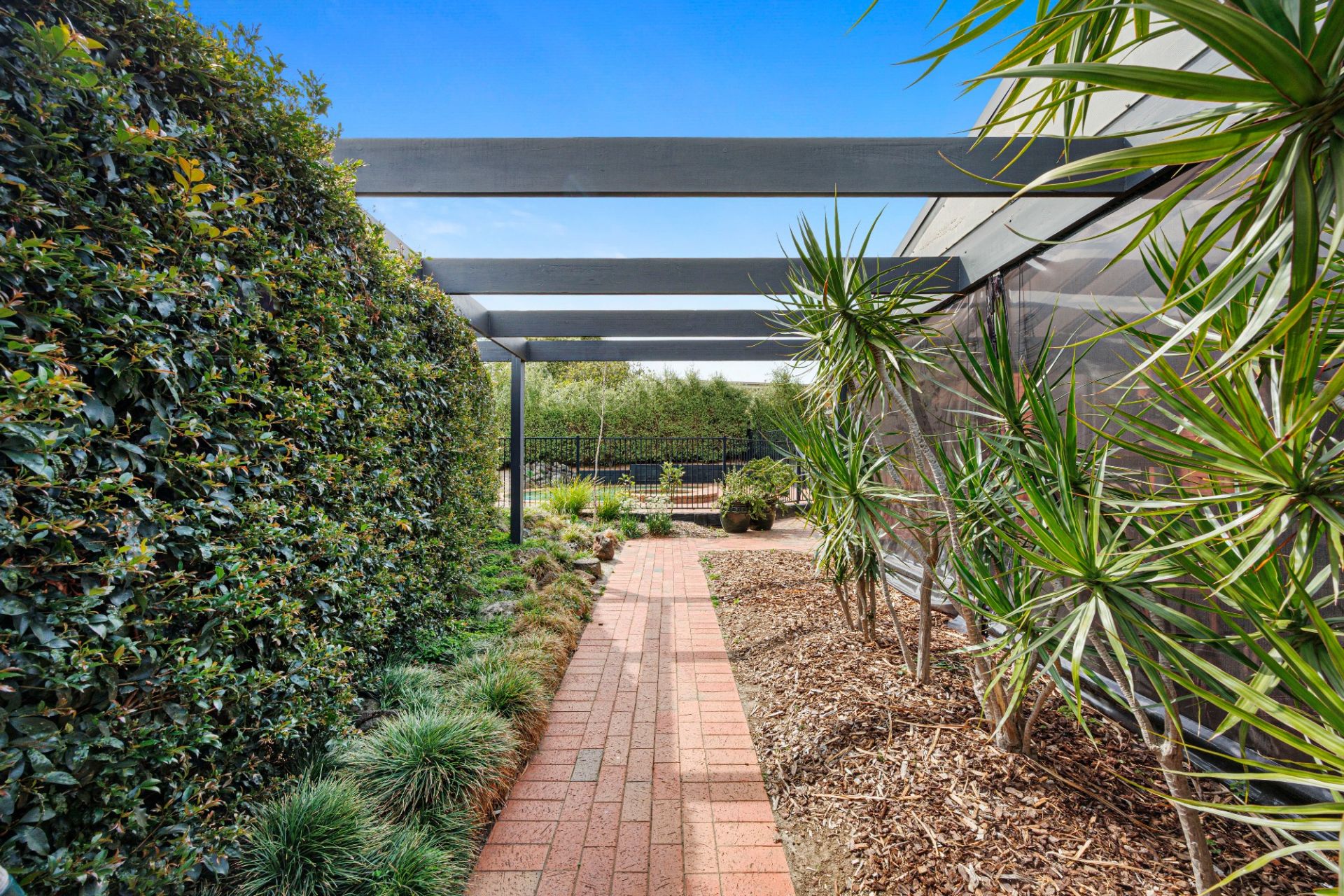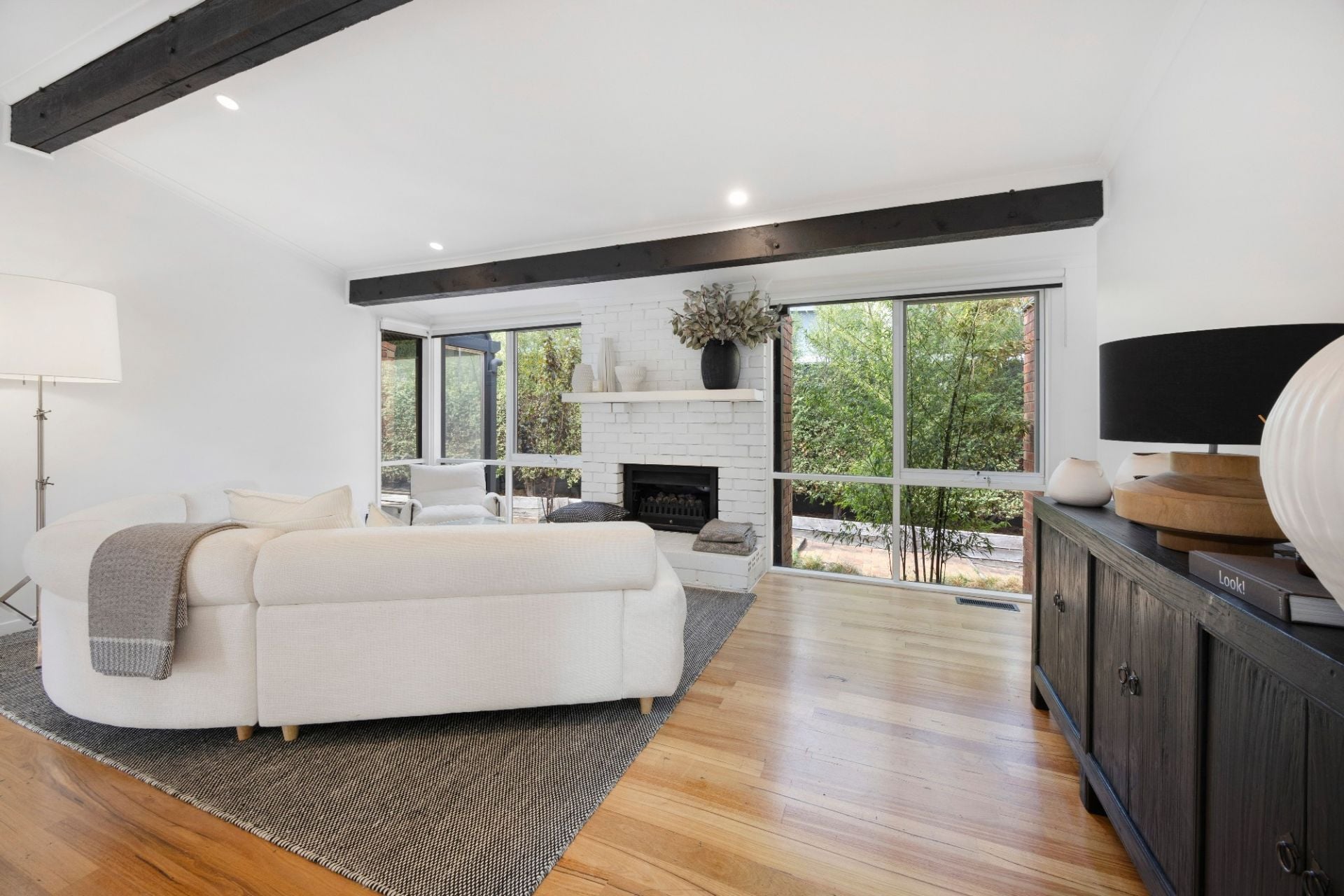 In the heart of the home, the main lounge offers sleek space with elevated ceilings, beautiful floorboards, fireplace and lovely outlooks to bamboo gardens, while a tiled rumpus lounge currently also serves as a gym beside a sauna.