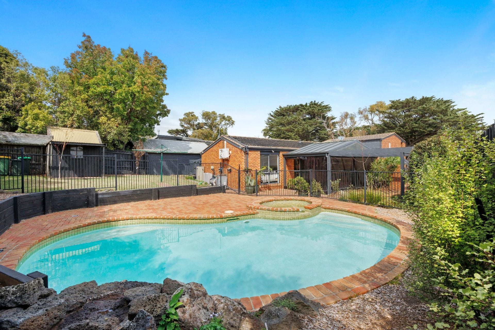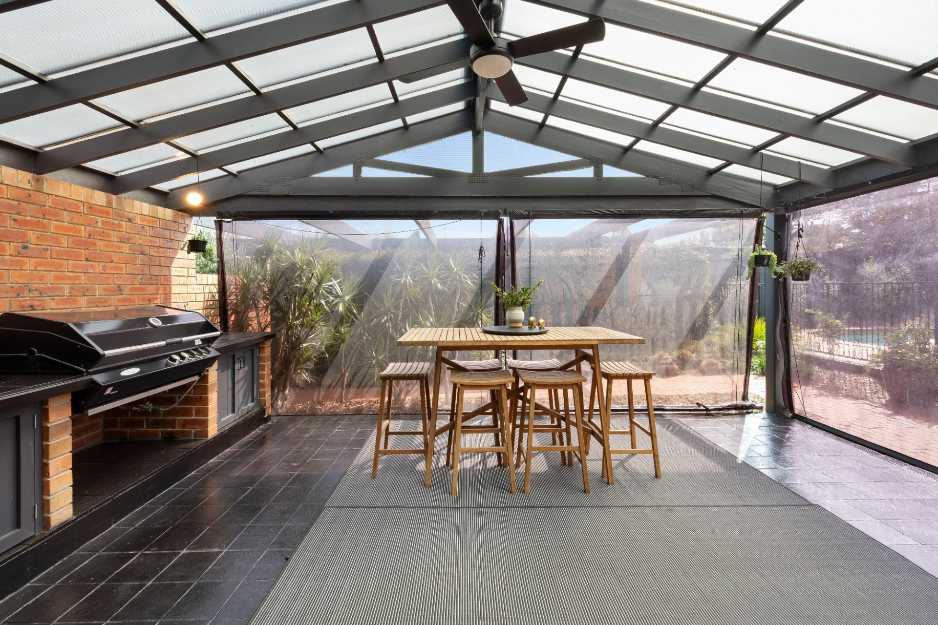 An open-plan family room flows out to a covered alfresco terrace with a BBQ and clear all-weather bistro blinds, backdropped by beautiful lush gardens and the sparkling inground pool.
