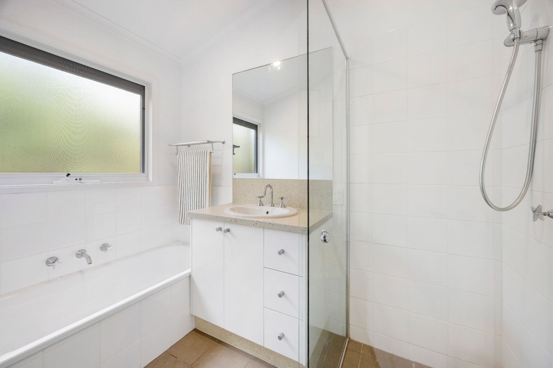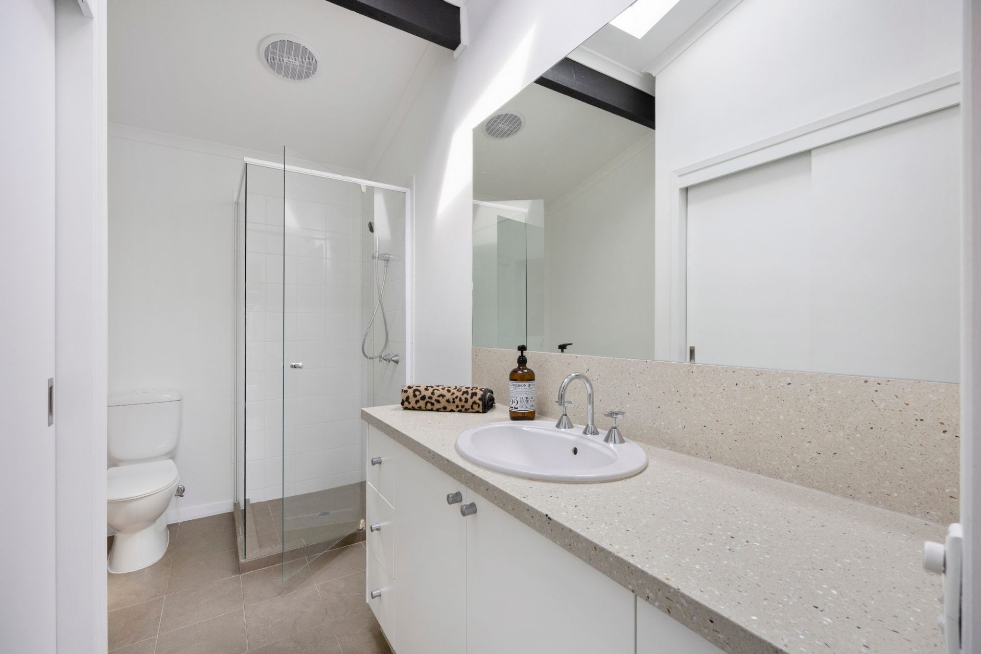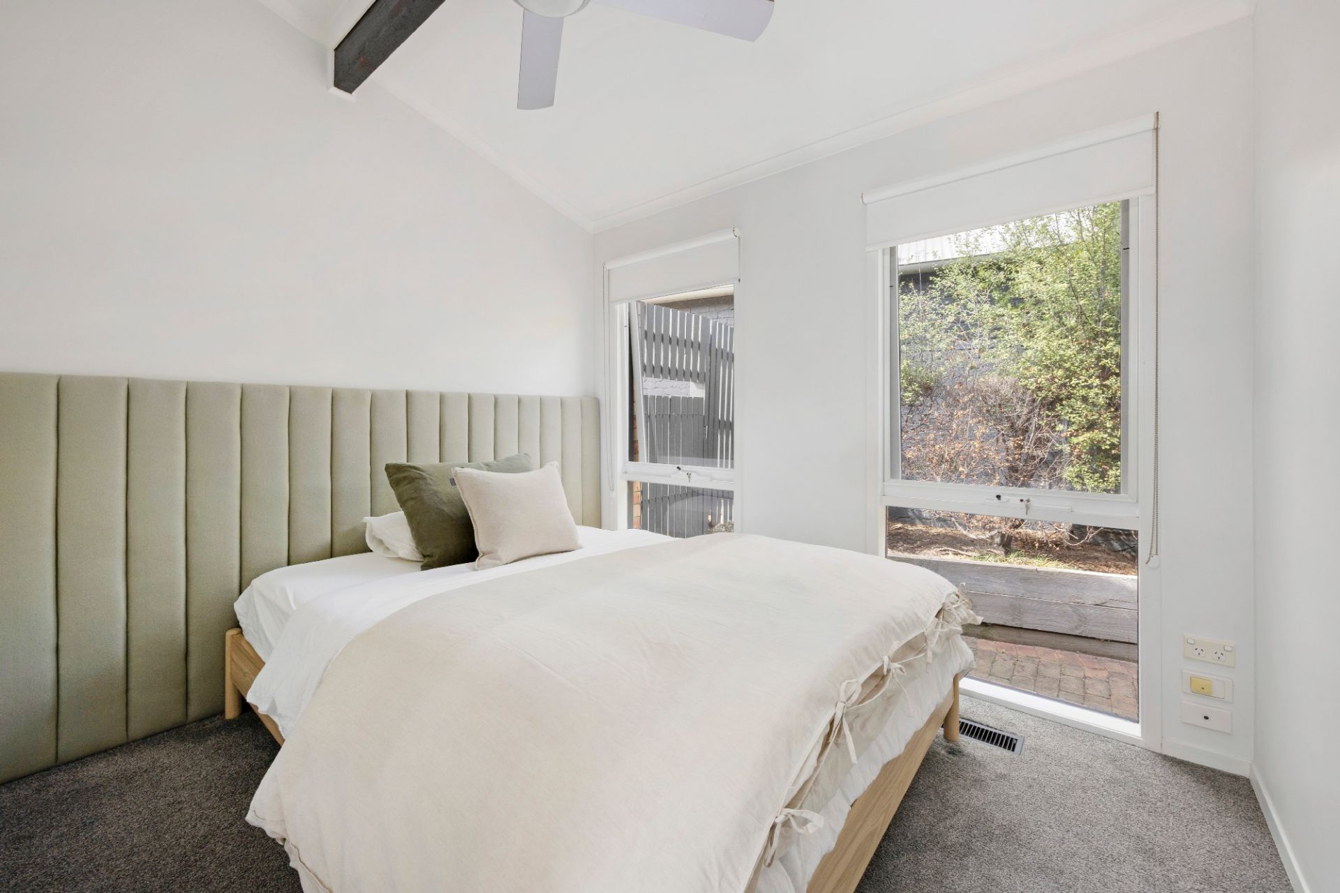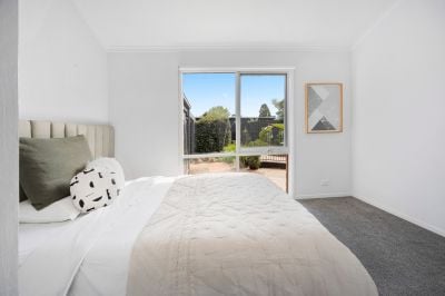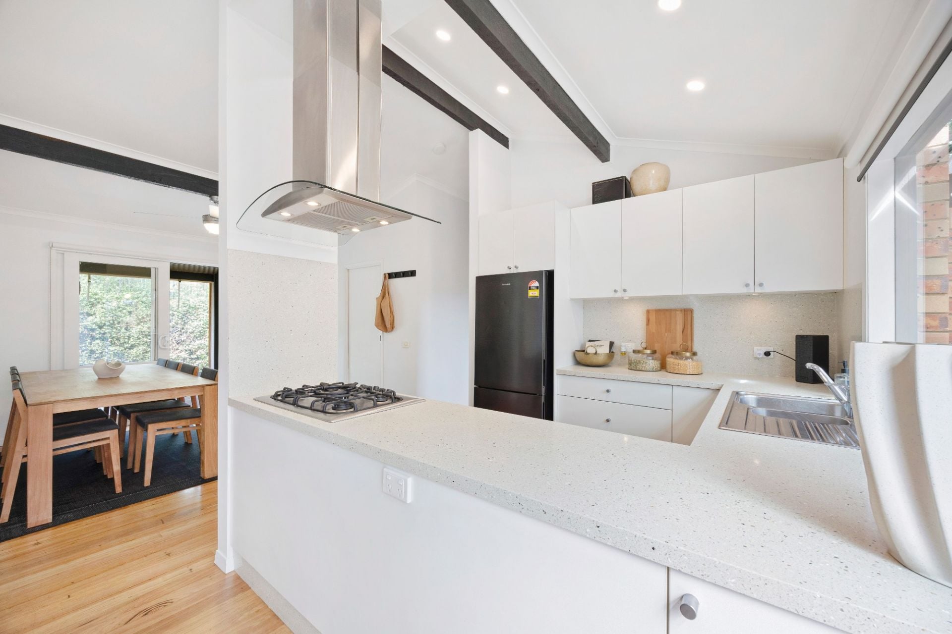The kitchen is a functional and stylish centrepiece equipped with Bosch appliances, with an adjacent dining area that opens to a charming semi-enclosed deck.
