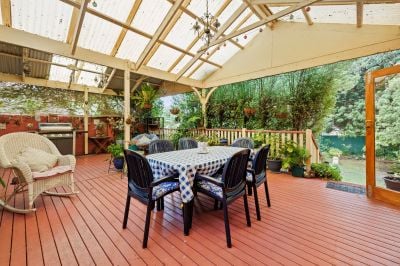 An adjoining dining hall and family room face concertina doors to an enormous covered deck that is an exceptional entertaining domain with abundant space for alfresco dining, outdoor lounging and year-round gatherings with steps down to enchanting established gardens with wonderful space for a playground.