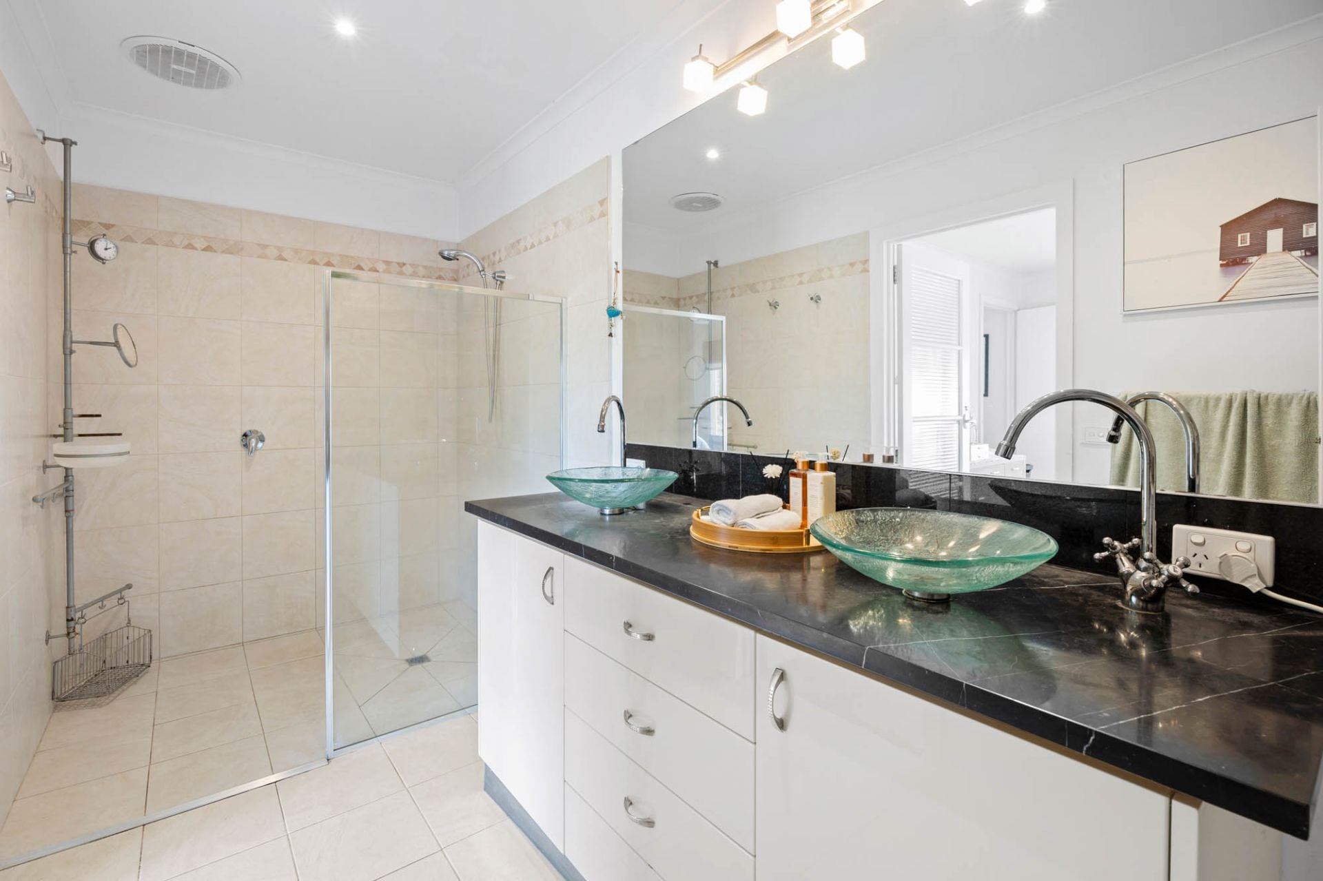 Upstairs, a magnificent parents' retreat provides an indulgent private haven, complete with a stylish ensuite featuring twin vanities and striking glass wash bowls, a walk-in robe and space to lounge, with views over treetops and glimpses of the bay.